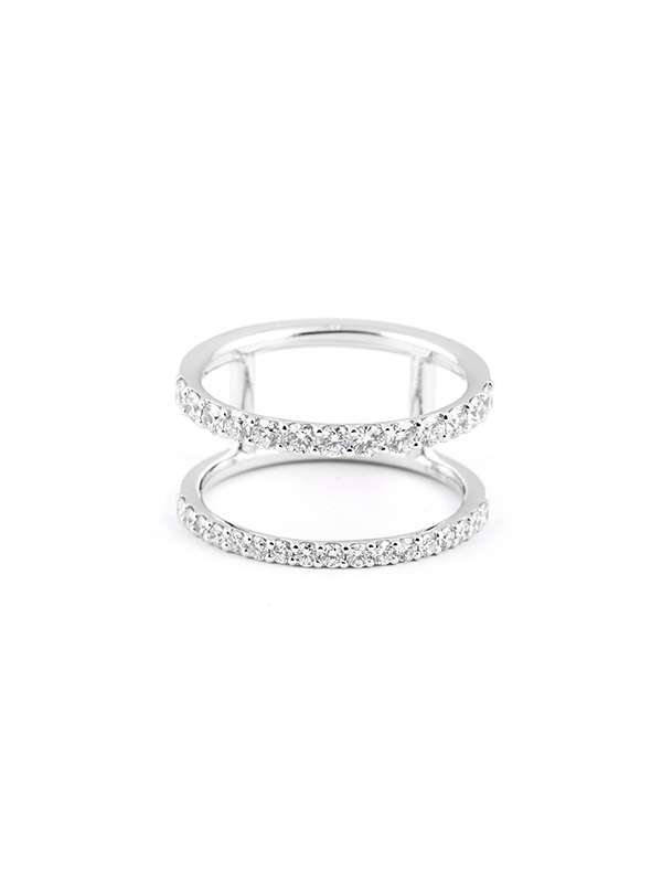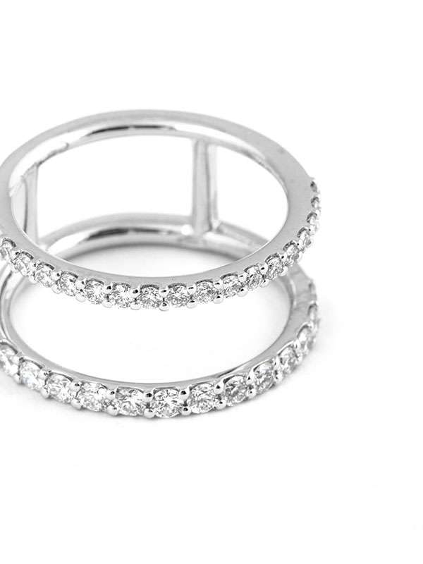 Gioiello firmato Crivelli. Anello in oro bianco 18kt con due file decorate sul lato frontale da diamanti bianchi taglio brillante per un totale di carati 0,70 colore F purezza VS. Misura 13. Peso oro 18kt gr. 4,50.
