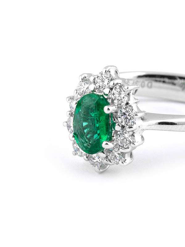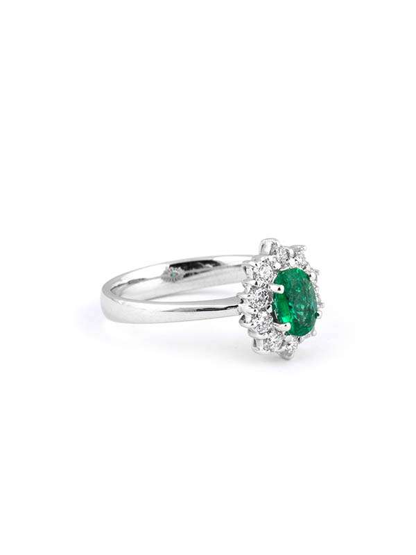 Anello in oro bianco 18kt con smeraldo centrale taglio ovale carati 0,60 contornato da diamanti taglio brillante per carati 0,54 colore D/E purezza SI1. Misura 14. Peso oro gr.4,07.