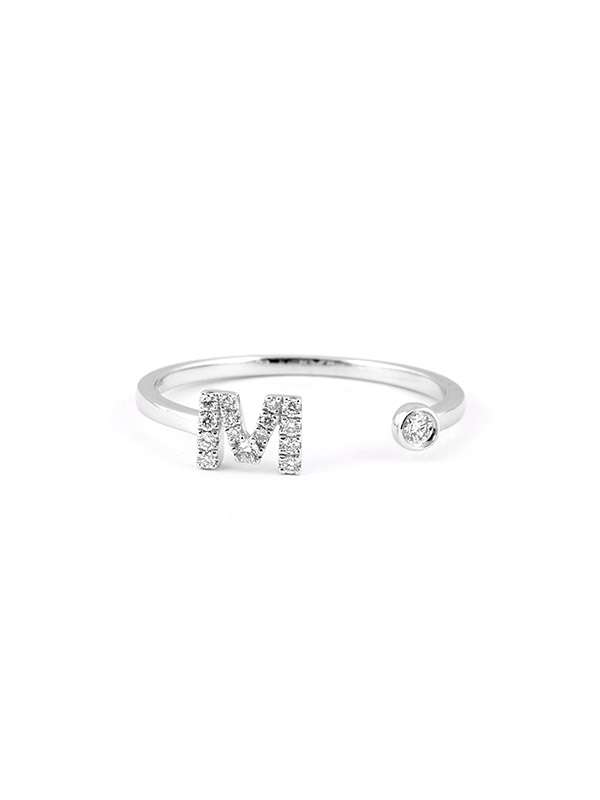 Gioiello firmato Crivelli. Anello aperto in oro bianco 18kt con lettera M di diamanti.