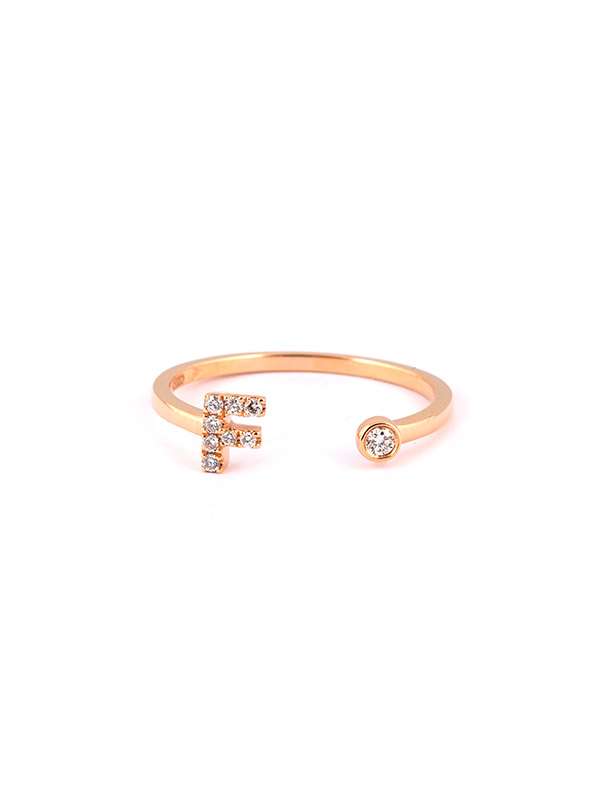 Gioiello firmato Crivelli. Anello aperto in oro rosa 18kt lettera F con diamanti.