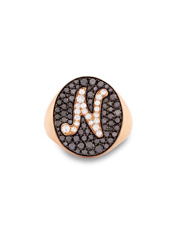 Gioiello firmato Crivelli. Anello in oro rosa 18kt con lettera N in diamanti su pavè di diamanti neri. Finitura sabbiata e lavorazione a giorno sul retro. Versione grande. Anello pavé estremamente raffinato destinato a durare in eterno. Realizzato con diamanti naturali e neri e oro rosa 18kt. Il numero delle pietre varia in base alla proporzione a alla misura. Gioiello realizzato in Italia. Per qualsiasi necessità o richiesta particolare, o per prenotare un appuntamento in negozio per valutare il prodotto di persona, non esitate a contattarci, siamo a vostra disposizione.