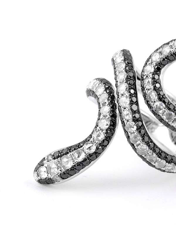 Anello a serpente in oro rosa 18kt con diamanti bianchi e diamanti neri. Anello fantasia così chiamato perché si caratterizza per il proprio design e per i materiali che interagiscono tra loro. Questo è realizzato in oro rosa 18kt e diamanti naturali taglio brillante e diamanti brown taglio rosetta. Il numero delle pietre varia in base alla proporzione a alla misura. Gioiello realizzato in Italia. Per qualsiasi necessità o richiesta particolare, o per prenotare un appuntamento in negozio per valutare il prodotto di persona, non esitate a contattarci, siamo a vostra disposizione.