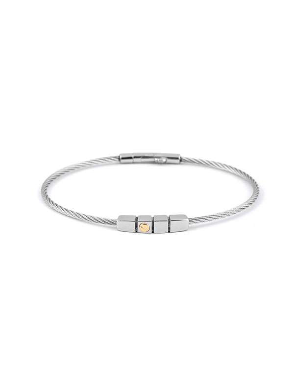 Bracciale Salvatore Bersani collezione B-JOY con cavetto in acciaio e vite in oro giallo. La collezione BJoy plasma l’acciaio secondo la filosofia del marchio Salvatore Bersani: prediligere l’eleganza e la cura dei particolari nella realizzazione di gioielli unici, che esprimano un concetto di lusso che non ha bisogno di essere evidente per essere notato. L’acciaio ritorto che conferisce l’anima dei bracciali, si presenta nel suo aspetto naturale o rivestito da eleganti sfumature di colore, come il blu, l’antracite ed il bronzo. Gli elementi accessori sono molteplici e costituiscono le varie personalità della collezione, che spazia da articoli minimal ad articoli più preziosi con motivi in oro 18 carati e diamanti. I gioielli sono interamente realizzati in Italia e la loro composizione è frutto di manodopera qualificata che assembla singolarmente ogni elemento per conferire al prodotto unicità e valore aggiunto.