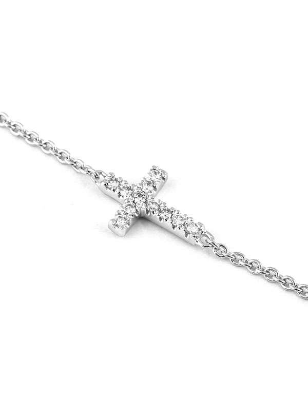 Gioiello firmato Crivelli. Bracciale in oro bianco 18kt con croce sdraiata decorata da diamanti bianchi per un totale di carati 0,04. Dimensione croce 8mm x 5mm. Catena a maglia rolò cm. 17,5. Chiusura a gancetto. Tre anellini per la regolazione della misura. Peso oro 18kt gr. 1,00.