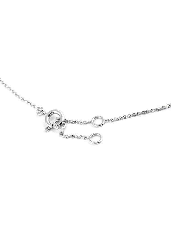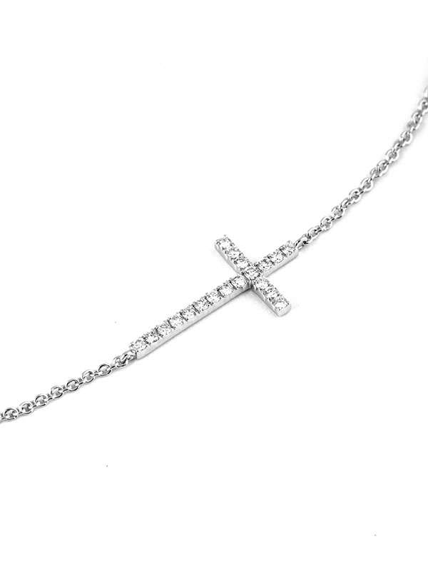 Gioiello firmato Crivelli. Bracciale in oro bianco 18kt con croce sdraiata decorata da diamanti bianchi per un totale di carati 0,10. Dimensione croce 15mm x 8mm. Catena a maglia rolò cm. 17,5. Chiusura a gancetto. Tre anellini per la regolazione della misura. Peso oro 18kt gr. 1,00.