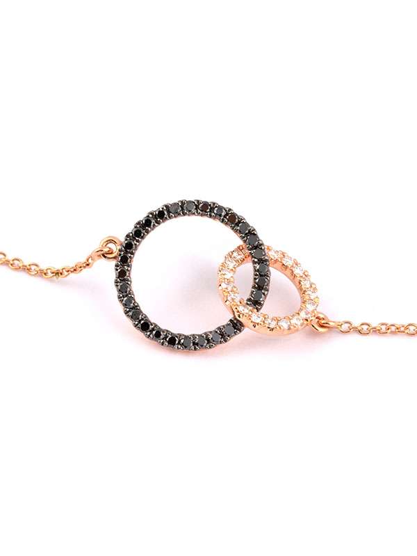 Gioiello firmato Crivelli. Bracciale in oro rosa 18kt con due cerchi intrecciati, di cui uno decorato da 19 diamanti bianchi taglio brillante per un totale di carati 0,08 colore G purezza SI1, l'altro da 29 diamanti neri per un totale di carati 0,16. Catena a maglia rolò cm 17,5. Chiusura a gancetto. Tre anellini per la regolazione della misura. Peso oro 18kt gr. 1,60.