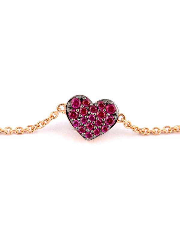 Gioiello firmato Crivelli. Bracciale in oro rosa 18kt con cuore decorato da pavé di rubini per un totale di carati 0,08. Dimensione cuore 5mm x 5mm. Catena a maglia rolò cm. 17,5. Chiusura a gancetto. Tre anellini per la regolazione della misura. Peso oro 18kt gr. 1,10.