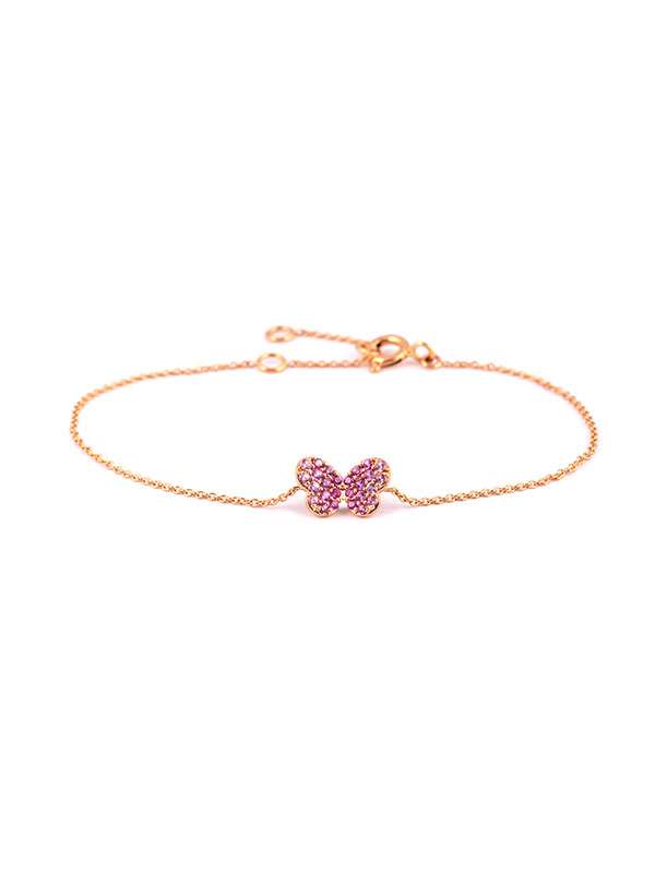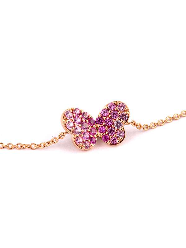 Gioiello firmato Crivelli. Bracciale in oro rosa 18kt con farfalla decorata da pavé di zaffiri rosa carati 0,27. Dimensione farfalla 11mm x 6mm. Catena a maglia rolò cm. 17,5. Chiusura a gancetto. Tre anellini per la regolazione della misura. Peso oro 18kt gr. 1,50.