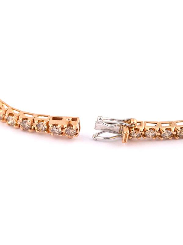 Gioiello firmato Crivelli. Bracciale tennis in oro rosa 18kt con 43 diamanti brown per un totale di carati 4,85. Lunghezza 17,5cm. Chiusura a scomparsa e fermaglio di sicurezza. Peso oro 18kt gr. 14,00.