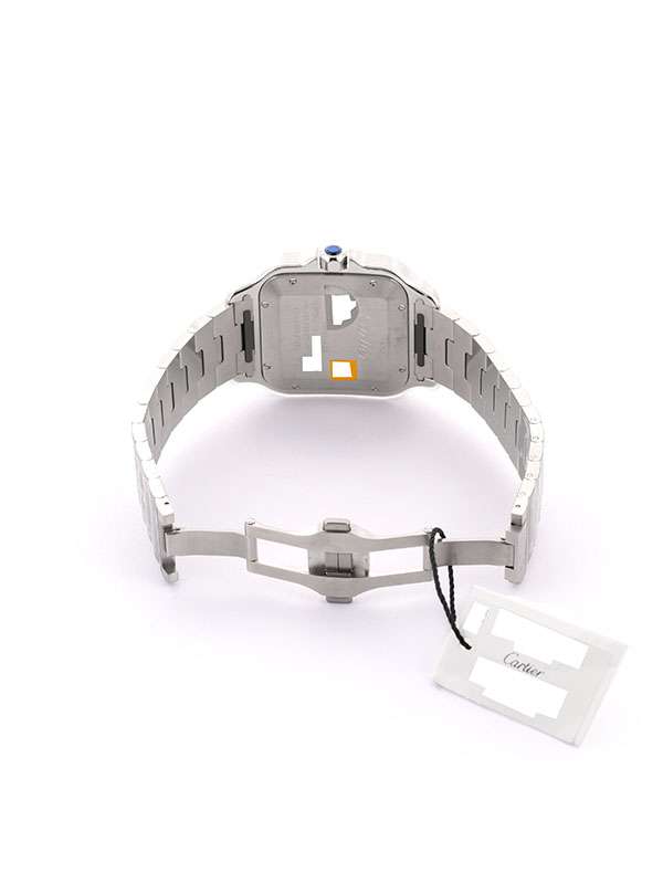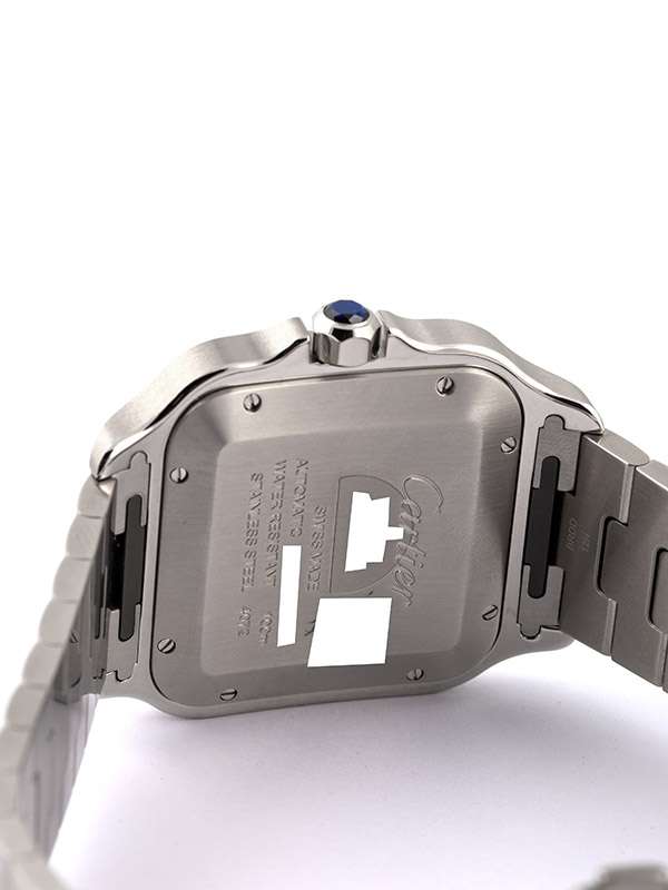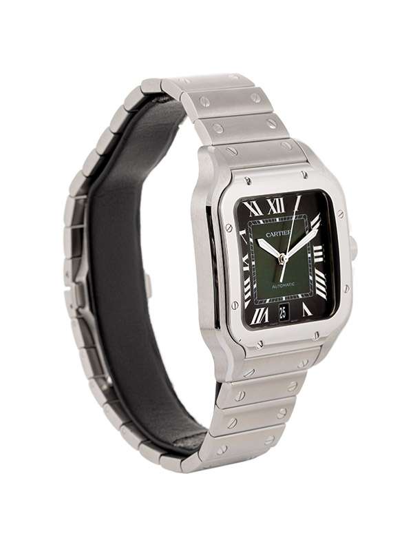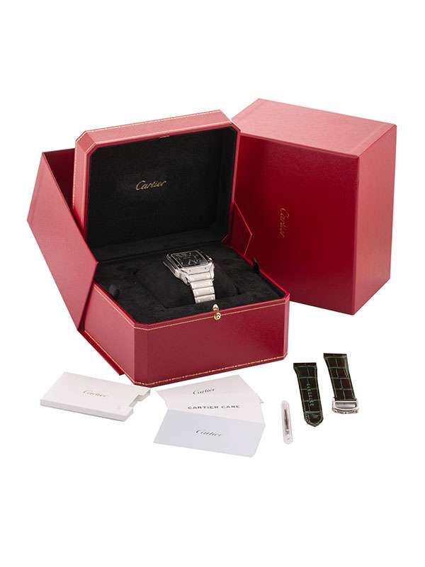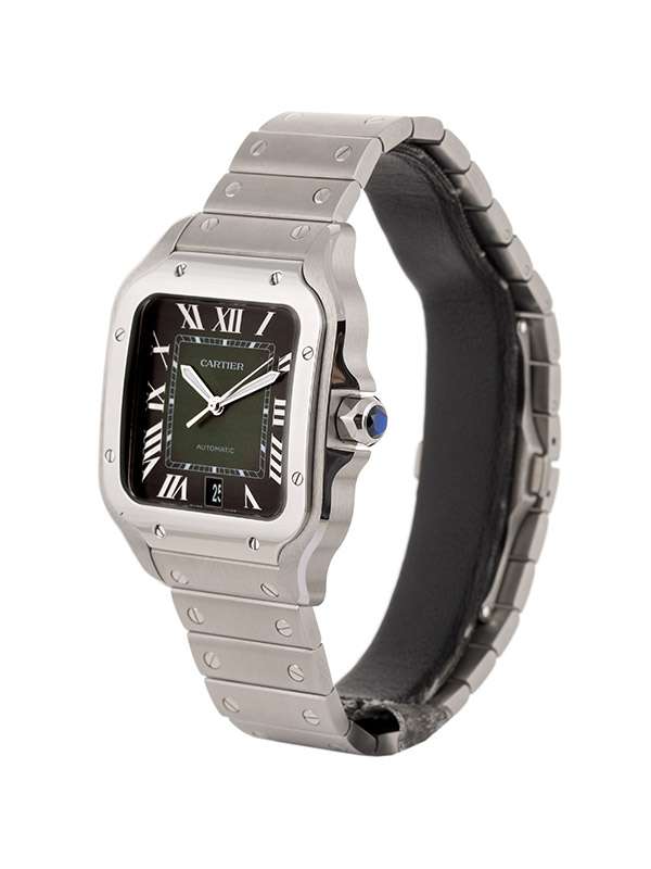Modello Santos de Cartier grande con cassa in acciaio. Cinturino in pelle di alligatore colore verde con fibbia pieghevole intercambiabile in acciaio. Bracciale in acciaio con sistema di regolazione della misura SmartLink. Bracciale e cinturino entrambi dotati del sistema di intercambiabilità QuickSwitch. Corona ettagonale ornata di uno spinello sintetico blu sfaccettato. Quadrante verde sfumato. Lancette a forma di gladio in acciaio lucido e materiale luminescente. Vetro zaffiro. Movimento meccanico a carica automatica. Calibro 1847 MC. Impermeabile fino a 100 metri.