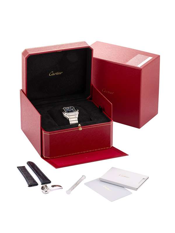 Modello Santos medio con cassa in acciaio. Bracciale in acciaio con sistema di regolazione della misura SmartLink. Secondo cinturino in pelle di alligatore blu fibbia pieghevole intercambiabile in acciaio. Entrambi dotati del sistema dintercambiabilità QuickSwitch. Corona ettagonale ornata di uno spinello sintetico blu sfaccettato. Quadrante blu sfumato. Lancette a forma di gladio in acciaio lucido. Vetro zaffiro. Movimento meccanico a carica automatica. Calibro 1847 MC. Impermeabile fino a 100 metri.