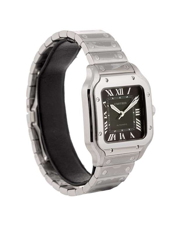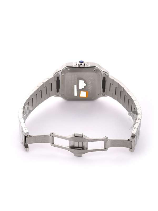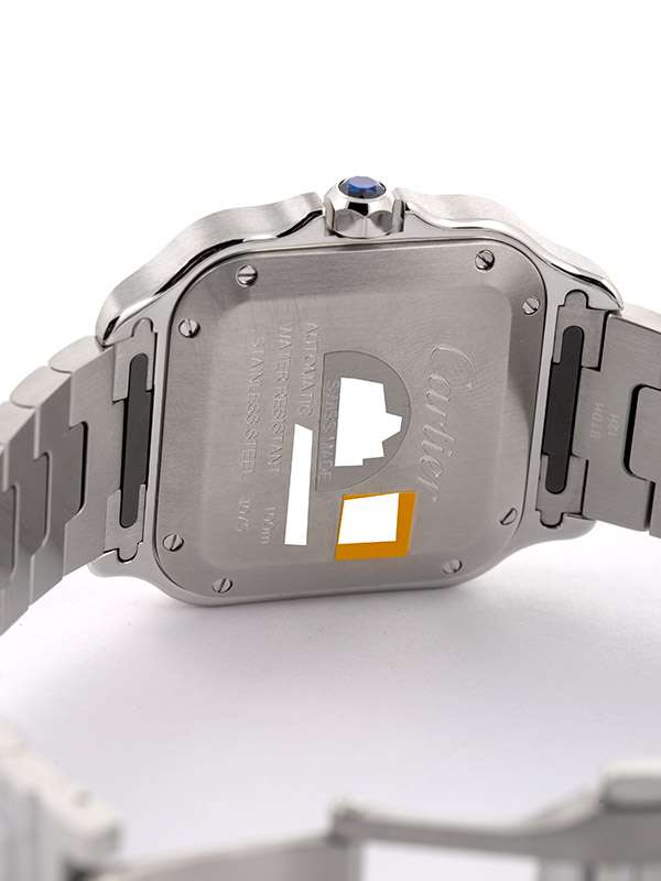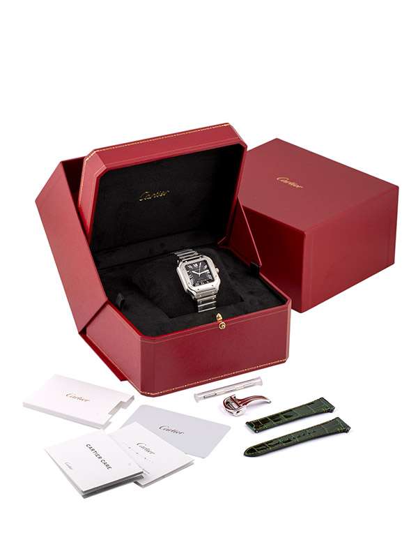 Modello Santos de Cartier medio con cassa in acciaio. Bracciale in acciaio con sistema di regolazione della misura SmartLink. Cinturino in pelle di alligatore verde con fibbia pieghevole intercambiabile in acciaio. Bracciale e cinturino sono entrambi dotati del sistema d’intercambiabilità QuickSwitch. Corona ettagonale ornata di uno spinello sintetico blu sfaccettato. Quadrante verde sfumato. Lancette a forma di gladio in acciaio lucido e materiale luminescente. Vetro zaffiro. Movimento meccanico a carica automatica. Calibro 1847 MC. Impermeabile fino a 100 metri.
