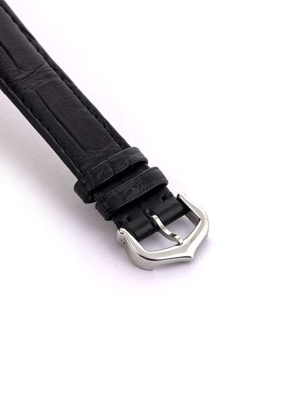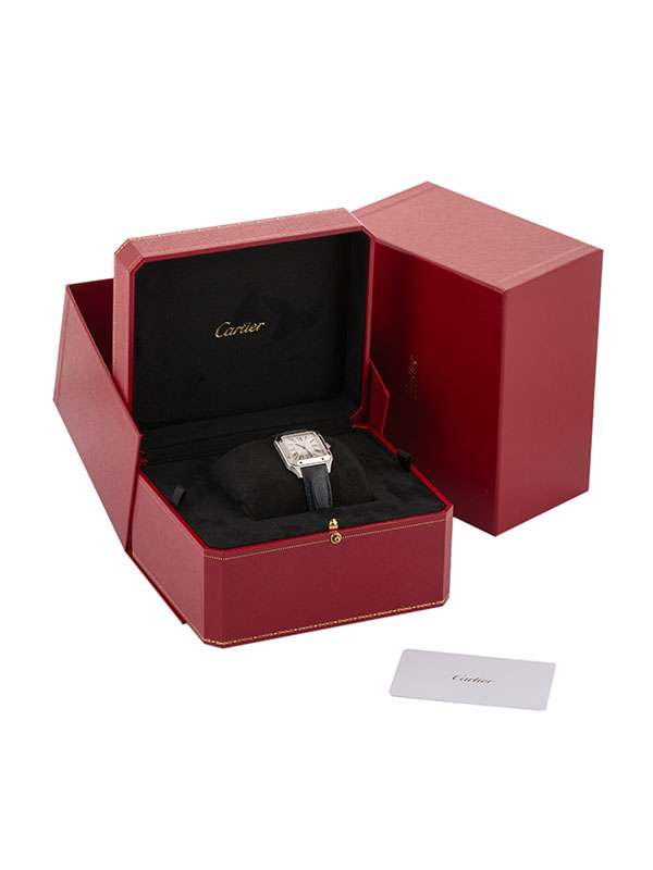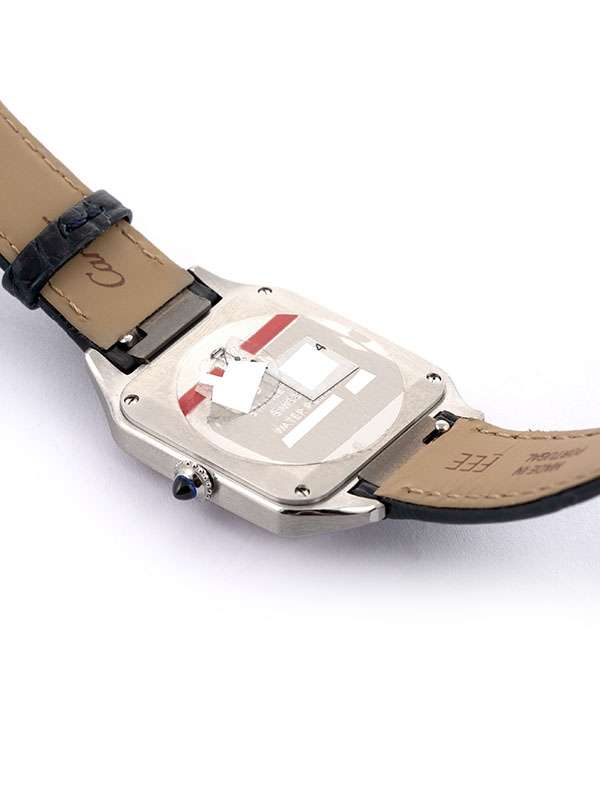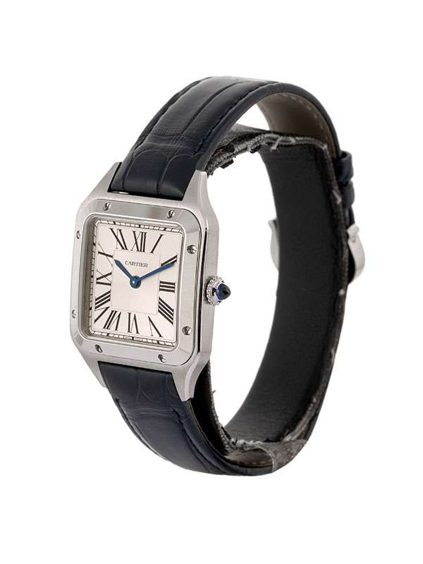 Modello piccolo con cassa in acciaio. Cinturino in pelle di alligatore blu navy, con fibbia ad ardiglione in acciaio. Corona perlata incastonata con uno spinello sintetico blu a forma di cabochon. Quadrante argentato satinato con effetto soleil numeri romani. Lancette a forma di gladio in acciaio azzurrato. Vetro zaffiro. Movimento al quarzo. Impermeabile fino 30 metri. Nel 1904, Louis Cartier esaudisce il desiderio del celebre aviatore brasiliano Alberto Santos Dumont: poter leggere l'ora mentre vola. La nascita di uno dei primi orologi da polso in assoluto suggella il legame di amicizia tra questi due pionieri. Gli angoli arrotondati del quadrante, la curvatura uniforme delle anse e le viti a vista creano un orologio iconico che avrebbe ispirato innumerevoli reinterpretazioni.