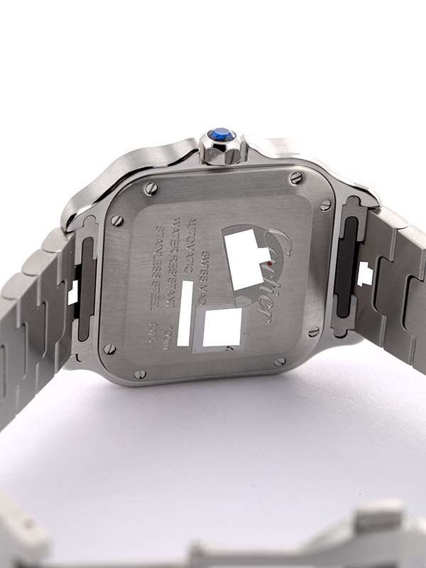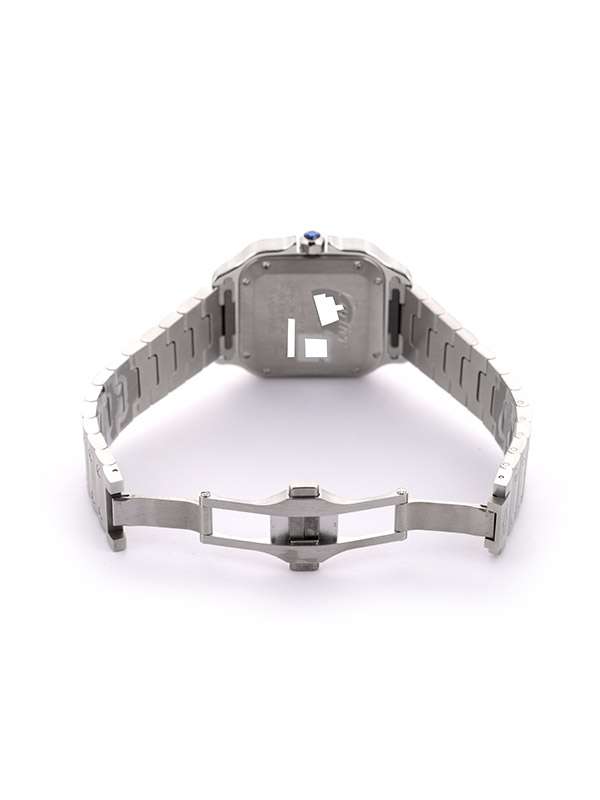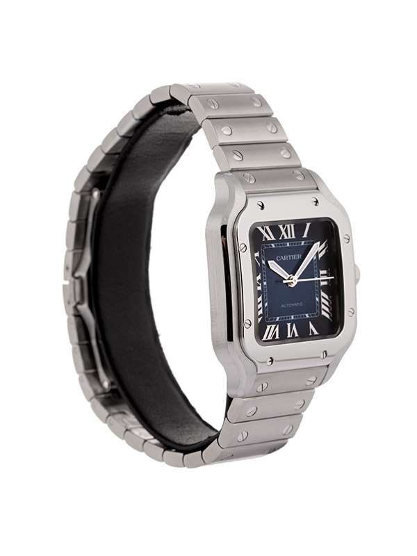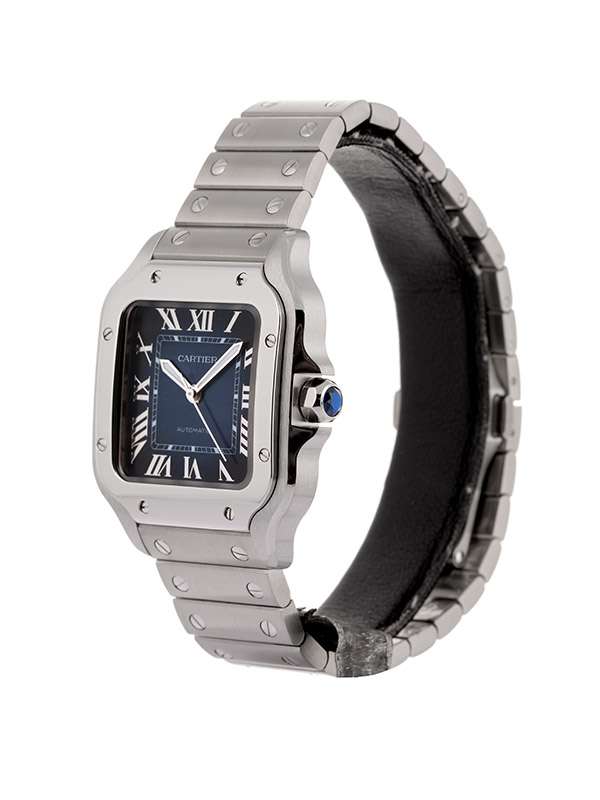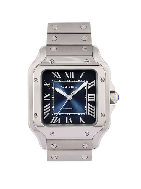 Modello Santos medio con cassa in acciaio. Bracciale in acciaio con sistema di regolazione della misura SmartLink. Secondo cinturino in pelle di alligatore blu fibbia pieghevole intercambiabile in acciaio. Entrambi dotati del sistema dintercambiabilità QuickSwitch. Corona ettagonale ornata di uno spinello sintetico blu sfaccettato. Quadrante blu sfumato. Lancette a forma di gladio in acciaio lucido. Vetro zaffiro. Movimento meccanico a carica automatica. Calibro 1847 MC. Impermeabile fino a 100 metri.