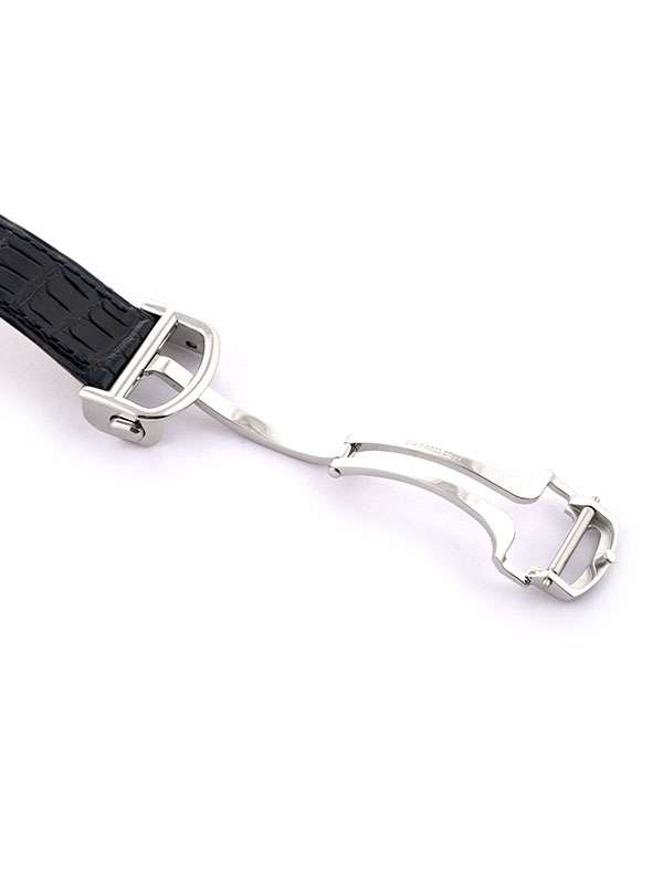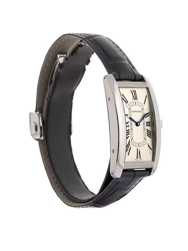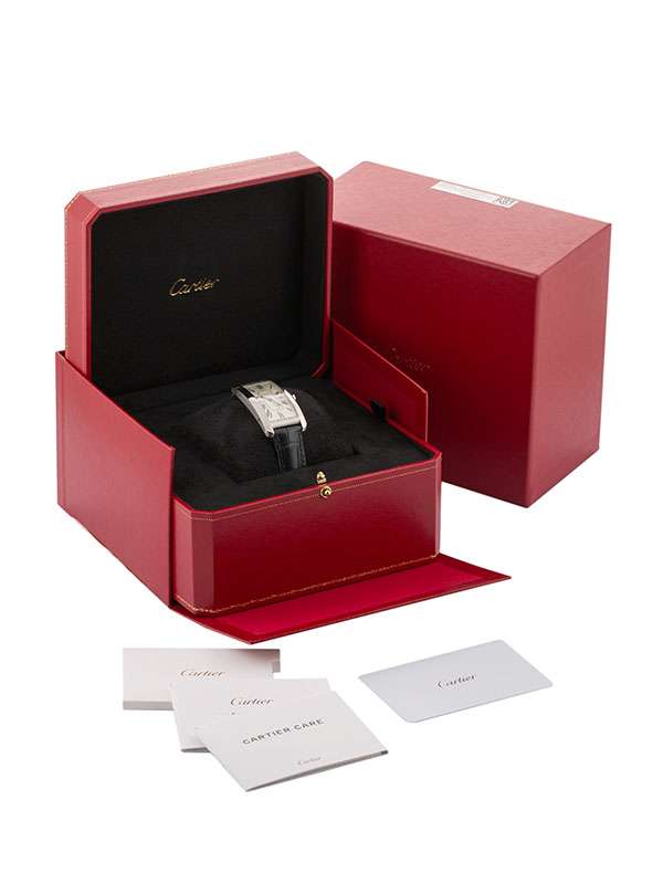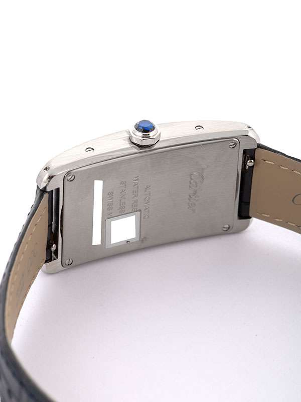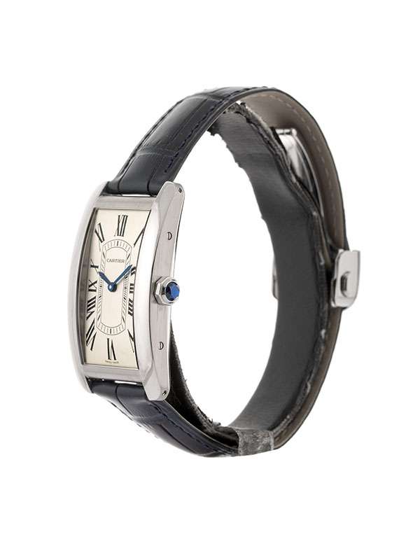 Modello Tank Américaine, modello grande, con cassa in acciaio. Cinturino in pelle di alligatore semi-opaco blu navy con fibbia pieghevole intercambiabile in acciaio. Corona poligonale ornata di uno spinello sintetico blu sfaccettato. Quadrante argentato satinato. Lancette a forma di gladio in acciaio azzurrato. Vetro zaffiro. Movimento meccanico a carica automatica. Impermeabile fino a 30 metri. Disegnato da Louis Cartier nel 1917, l’orologio Tank è un’icona orologiera moderna. Un orologio-bracciale la cui identità è definita dalla scelta di un design essenziale, che abbina geometria e proporzioni precise. Immediatamente riconoscibile e sempre al passo con i tempi, il Tank è stato reinterpretato per oltre un secolo in una serie di varianti che rimangono fedeli allo spirito del design originale, come dimostrano il Tank Cintrée, il Tank Chinoise, il Tank Américaine e il Tank Française.