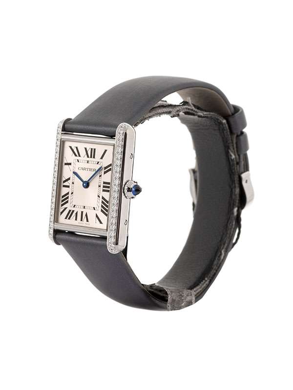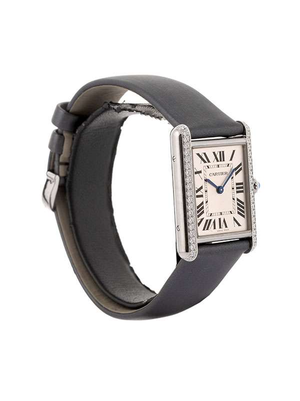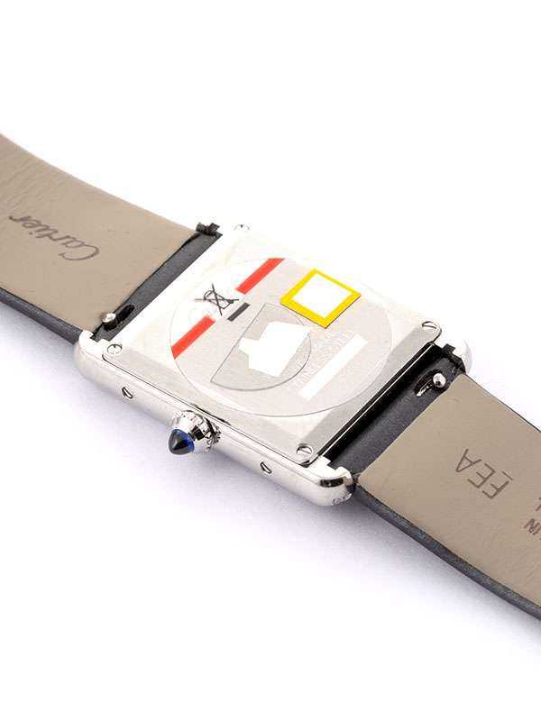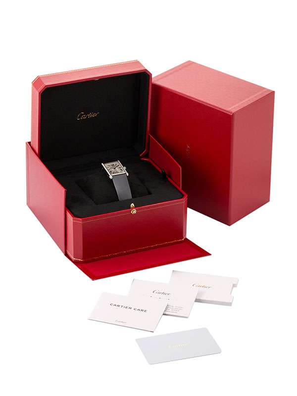Modello Tank Must grande con cassa in acciaio. Cinturino in pelle di vitello spazzolato nero con chiusura ad ardiglione e fermaglio in acciaio. Corona perlata ornata di uno spinello sintetico cabochon. Lunetta decorata con 42 diamanti taglio brillante. Quadrante argentato con numeri romani. Lancette a forma di gladio in acciaio azzurrato. Movimento al quarzo. Impermeabile fino a 30 metri. Progettato da Louis Cartier nel 1917, l'orologio Tank è un'icona dell'orologeria moderna. Il design elegante di questo orologio da polso, che unisce geometria e proporzioni precise, ne definisce l'identità audace. Immediatamente riconoscibile e sempre al passo con i tempi, il Tank è stato reinterpretato per oltre un secolo in una miriade di varianti fedeli allo spirito del design originale: Tank Cintrée, Tank Chinoise, Tank Américaine, Tank Française...