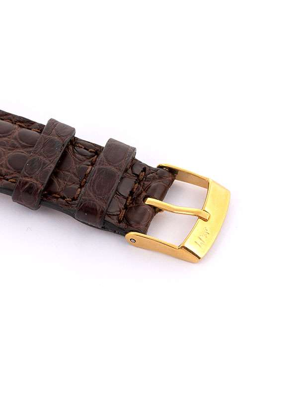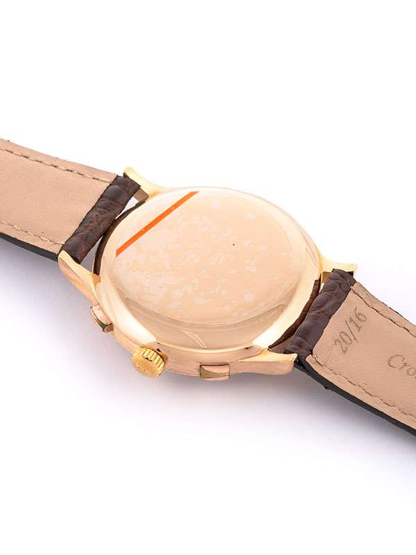 Modello Vintage con cassa in oro giallo 18kt. Cinturino in pelle e chiusura ad ardiglione. Quadrante champagne, indici e numeri arabi. Cronografo e tachimetro. Vetro plastica. Movimento meccanico a carica manuale Valjoux 65 Calibro 16000. Orologio Vintage anni '90.