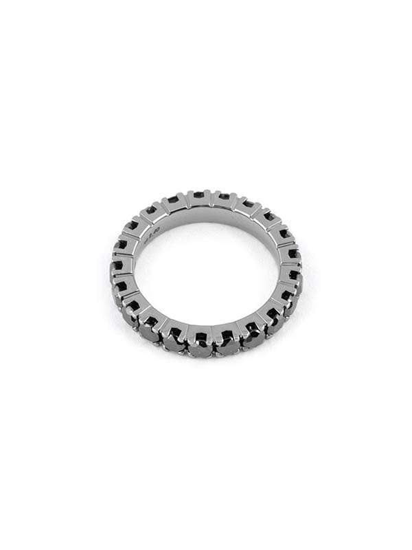 Fedina eternelle in oro bianco 18kt con diamanti neri. L'eternelle, o girodito, è un anello composto da pietre poste in tutta la circonferenza dell'anello: la più classica è indubbiamente quella realizzata in oro bianco 750% e diamanti naturali taglio brillante. Il numero delle pietre varia in base alla proporzione e alla misura. La montatura è realizzata a filo, ovvero ogni pietra è incastonata da 4 griffe. Previo preventivo concordato con noi, l'eternelle può essere realizzata con pietre di diversa caratura e di differente purezza, taglio e colore. Per qualsiasi necessità o richiesta particolare, o per prenotare un appuntamento in negozio per valutare il prodotto di persona, non esitate a contattarci, siamo a Vostra disposizione.