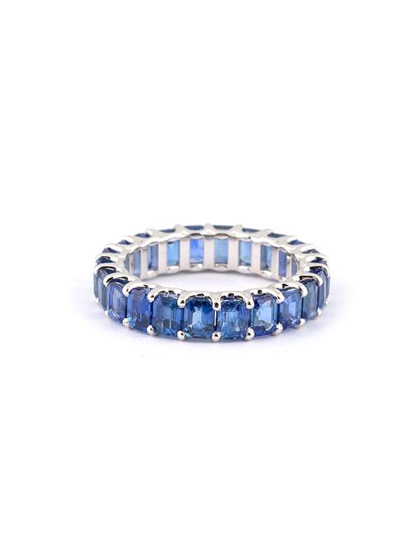 Fedina eternelle in oro bianco con zaffiro blu taglio smeraldo. L'eternelle, o girodito fantasia, è un anello composto da pietre poste in tutta la circonferenza dell'anello solitamente realizzata in oro bianco 750% e diamanti naturali con tagli speciali e pietre varie. Previo preventivo concordato con noi, l'eternelle può essere realizzata con pietre di diversa caratura e di differente purezza, taglio e colore. Per qualsiasi necessità o richiesta particolare, o per prenotare un appuntamento in negozio per valutare il prodotto di persona, non esitate a contattarci, siamo a Vostra disposizione.