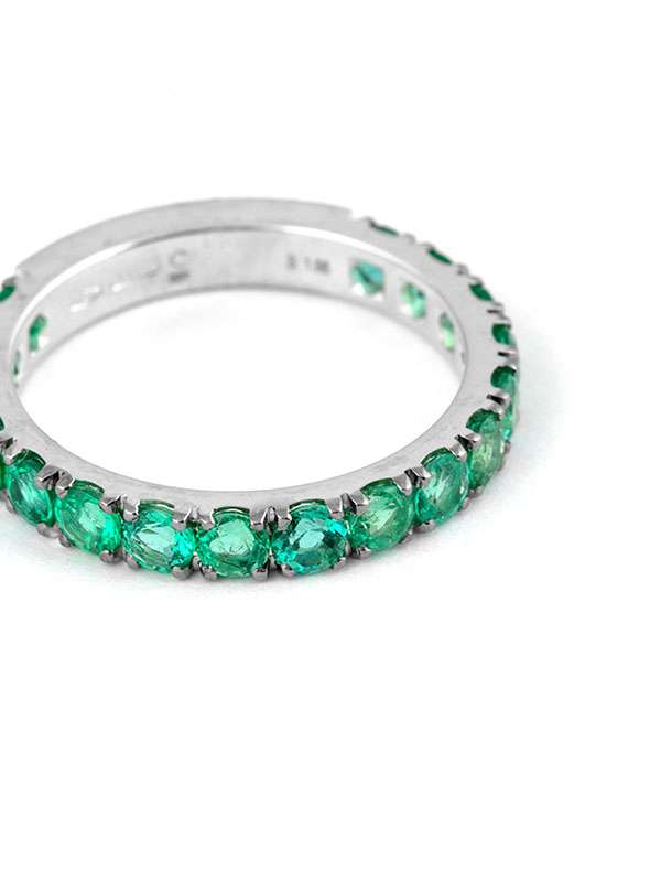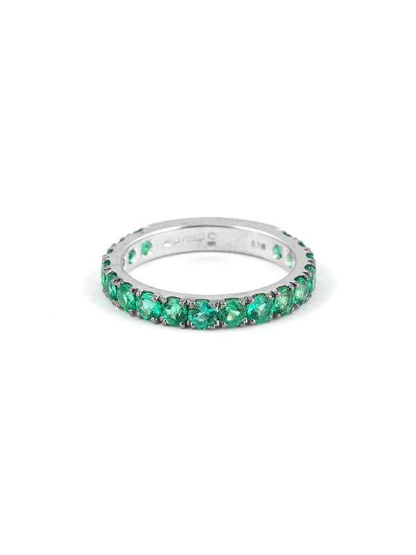 Gioiello firmato Crivelli. Fedina mezza eternelle in oro bianco 18kt con 17 semraldi per un totale di carati 1,66. Misura 14. Peso oro 18kt gr. 3,10.