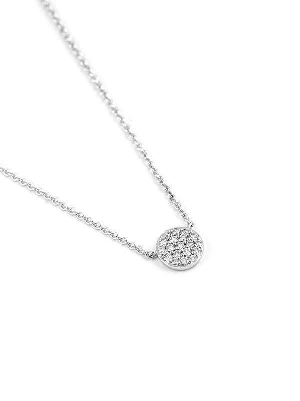 Gioiello firmato Crivelli. Girocollo in oro bianco 18kt con bottoncino decorato da pavè di diamanti bianchi per un totale di carati 0,11 colore G purezza SI1. Dimensione bottoncino 6mm x 6mm. Catena a maglia rolò cm. 42. Chiusura a gancetto. Secondo anellino per la regolazione della misura. Peso oro 18kt gr. 1,90.