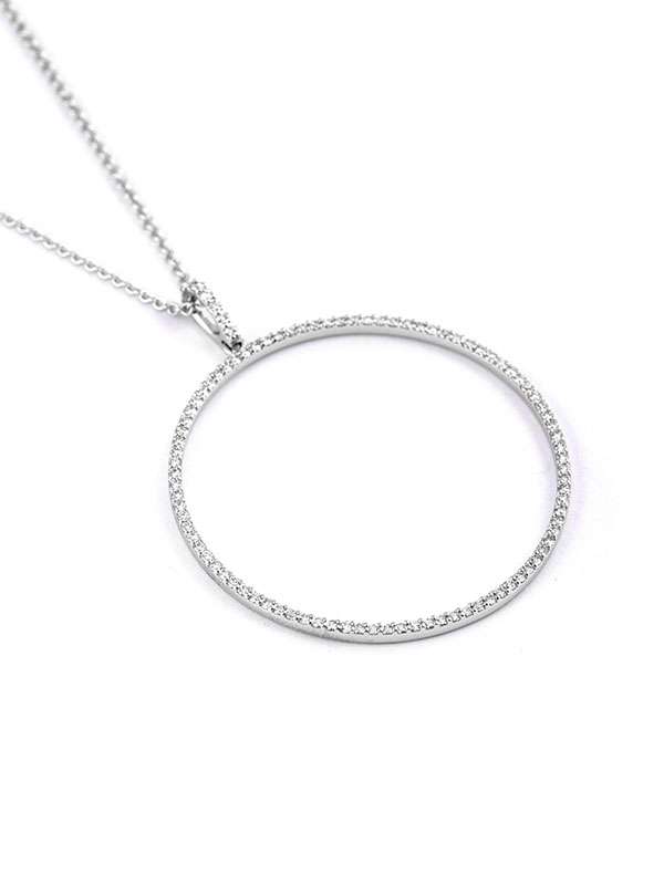 Gioiello firmato Crivelli. Girocollo in oro bianco 18kt con cerchio decorato da diamanti bianchi taglio brillante per un totale di carati 0,80 colore F purezza SI1. Diametro cerchio 40mm. Catena a maglia rolò cm. 84. Secondo anellino per regolare òa misura a 44cm. Peso oro 18kt gr. 9,80.
