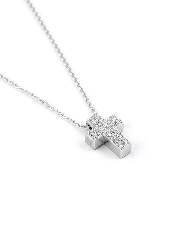 Girocollo con catena in oro bianco 18kt con pendente a forma di croce decorata da diamanti bianchi per un totale di carati 0,26 colore G purezza SI1. Catena a maglia rolò cm.42 e secondo anellino per la regolazione della lunghezza. Chiusura a moschettone. Peso oro 18kt gr. 1,85.