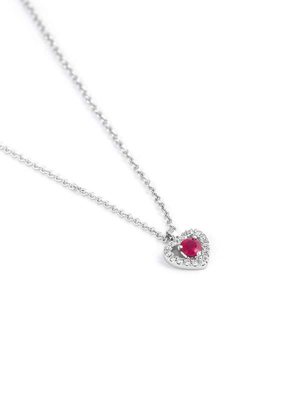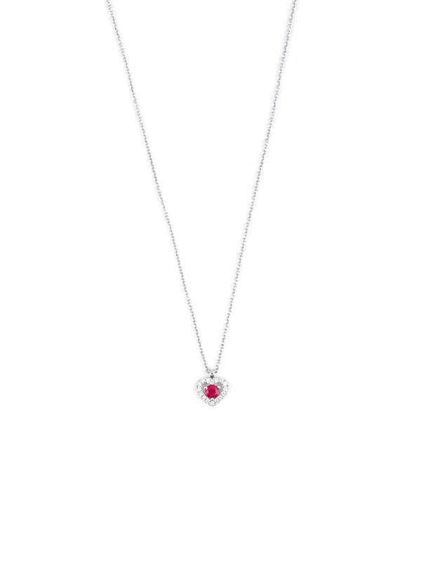 Gioiello firmato Crivelli. Girocollo in oro bianco 18kt con rubino rosso taglio cuore carati 0,12 contornato da diamanti bianchi taglio brillante per un totale di carati 0,06 colore G purezza SI1. Dimensione cuore 7mm x 6mm. Catena a maglia rolò cm. 42. Secondo anellino per la regolazione della misura. Peso oro 18kt gr. 1,80.