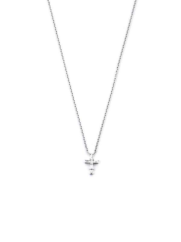 Girocollo in oro bianco 18kt con croce fissa decorata con diamanti taglio baguette. Catena a maglia rolò 42cm e anello per la regolazione della lunghezza. Chiusura a moschettone. Collezione Petra.