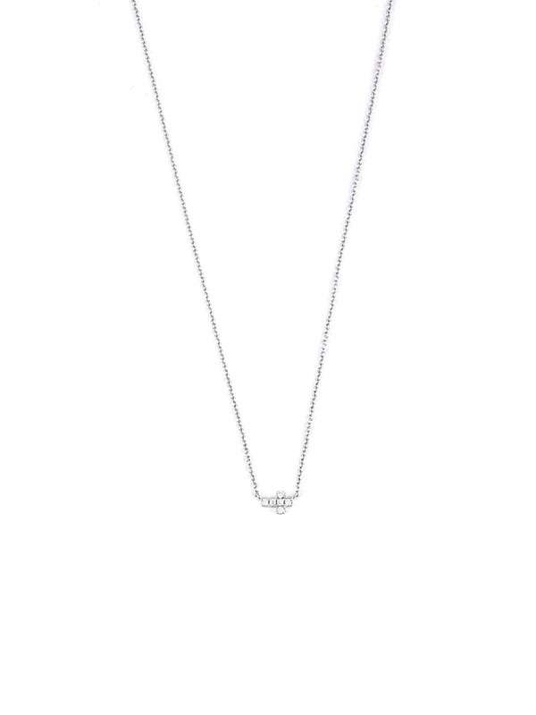 Gioiello firmato Crivelli. Girocollo in oro bianco 18kt con croce decorata da diamanti bianchi per un totale di carati 0,03 colore G purezza SI1. Dimensione croce 4mm x 3mm. Catena a maglia rolò cm. 42. Chiusura a gancetto. Secondo anellino per la regolazione della misura. Peso oro 18kt gr. 1,60.