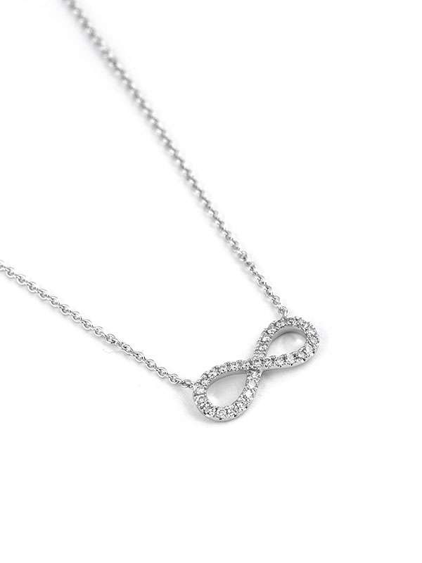 Gioiello firmato Crivelli. Girocollo in oro bianco 18kt con simbolo infinito decorato da diamanti bianchi per un totale di carati 0,11 colore G purezza SI1. Dimensione infinito 14mm x 5mm. Catena a maglia rolò cm. 42. Chiusura a gancetto. Secondo anellino per la regolazione della misura. Peso oro 18kt gr. 1,90.