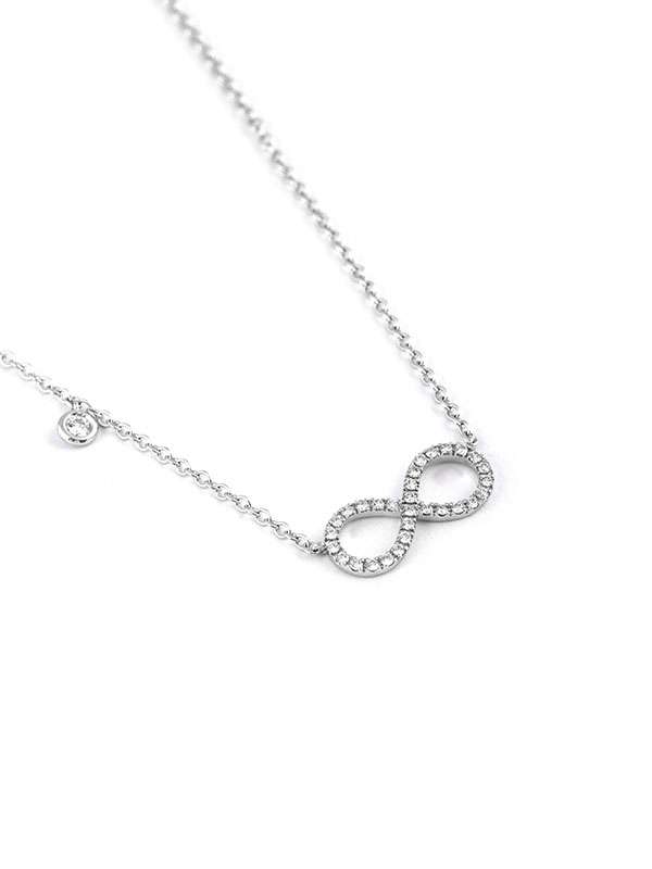 Gioiello firmato Crivelli. Girocollo in oro bianco 18kt con simbolo dell'infinito decorato da diamanti bianchi taglio brillante per un totale di carati 0,18 colore F purezza SI1. Dimensione infinito 7mm x 1,5mm. Catena a maglia rolò cm. 42. Secondo anellino per la regolazione della misura. Peso oro 18kt gr. 2,70.