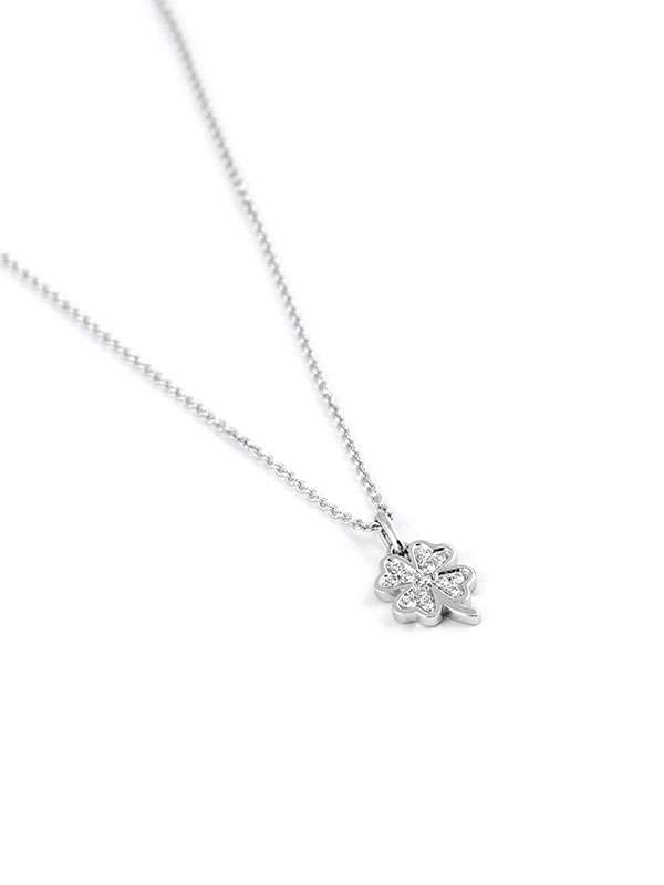 Gioiello firmato Crivelli. Girocollo in oro bianco 18kt con quadrifoglio decorato da pavé di diamanti bianchi per un totale di carati 0,08 colore G purezza SI1. Dimensione quadrifoglio 8mm x 10mm. Catena a maglia rolò cm. 42. Secondo anellino per la regolazione della misura. Peso oro 18kt gr. 2,30.