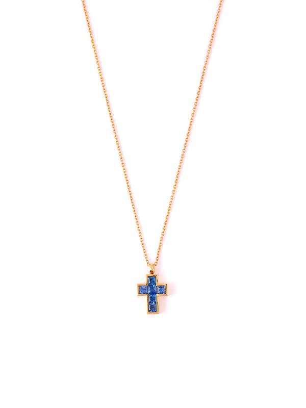 Girocollo in oro rosa 18kt con croce decorata da sei zaffiri. Dimensione croce 0,9mmx1,3mm. Catena a maglia rolò. Lunghezza 40cm. Chiusura a moschettone e secondo anellino per la regolazione della lunghezza.