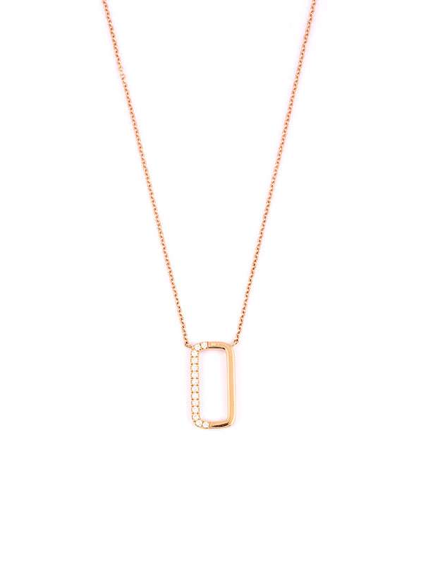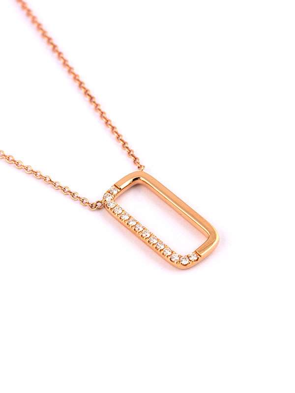 Gioiello firmato Crivelli. Girocollo in oro rosa 18kt con rettangolo decorato da diamanti per un totale di carati 0,16 colore F purezza SI1. Dimensione rettangolo 20mm x 10mm. Catena a maglia rolò cm. 42. Chiusura a moschettone. Peso oro 18kt gr. 3,90.