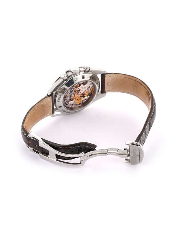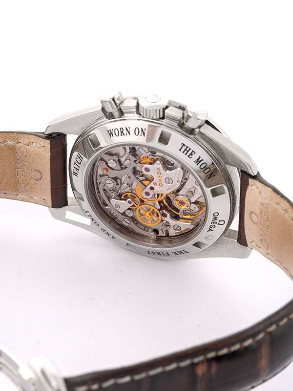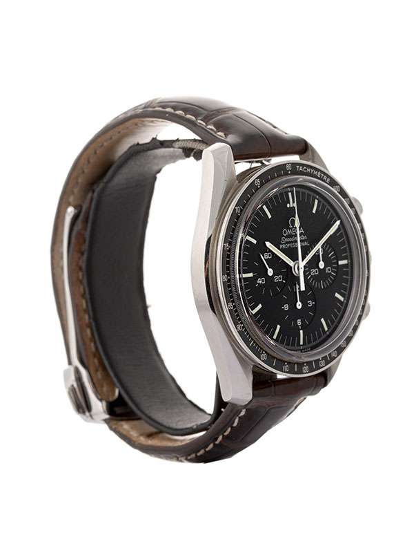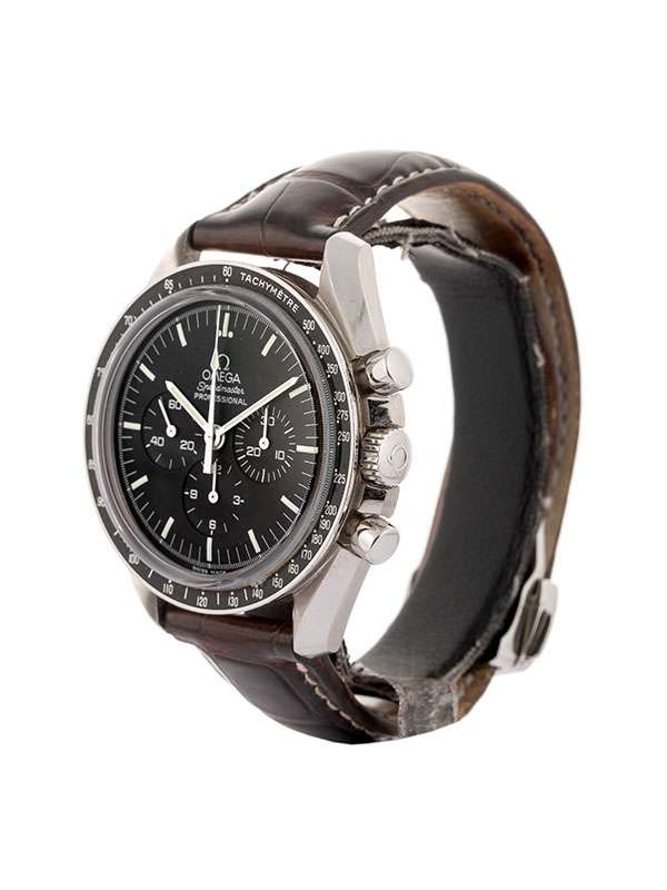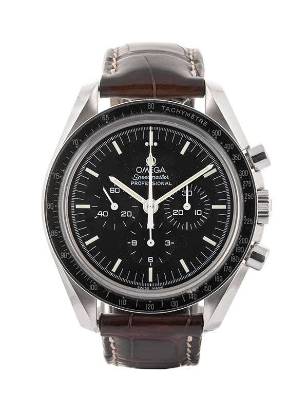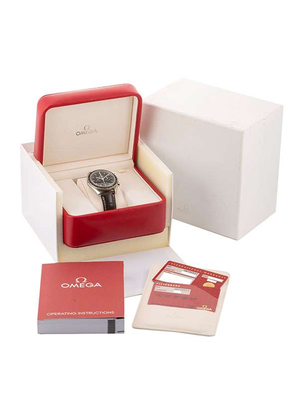 Modello con cassa in acciaio inossidabile. Cinturino in pelle nera con fermaglio déployante. Lunetta nera con scala tachimetrica. Quadrante nero. Vetro zaffiro bombato resistente ai graffi e antiriflesso. Quadrantino dei piccoli secondi. Contatori 30 minuti e 12 ore e lancetta cronografica centrale. Il cronografo è animato dal calibro meccanico OMEGA 1863, il famoso movimento manuale utilizzato sulla Luna, visibile attraverso il fondello trasparente. Movimento meccanico a carica manuale. L'OMEGA Speedmaster è uno dei segnatempo più iconici di OMEGA. Avendo partecipato a tutte e sei le missioni lunari, il leggendario Speedmaster incarna alla perfezione lo spirito avventuroso e pionieristico del marchio. Orologio corredato di scatola e garanzia anno 2011.