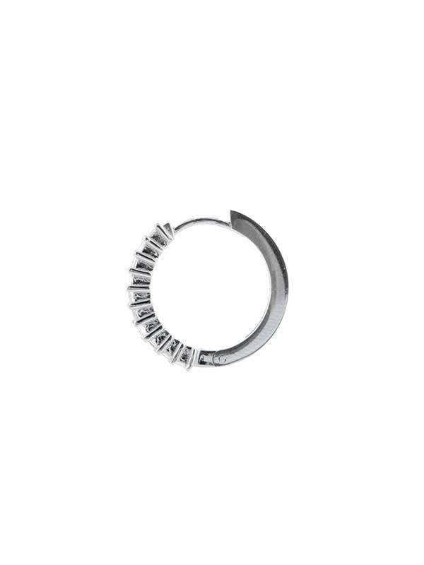 Orecchini a cerchio in oro bianco 18kt decorati con diamanti taglio baguette sulla parte frontale. Chiusura a gancetto. Diametro cerchio 15mm. Collezione Petra.