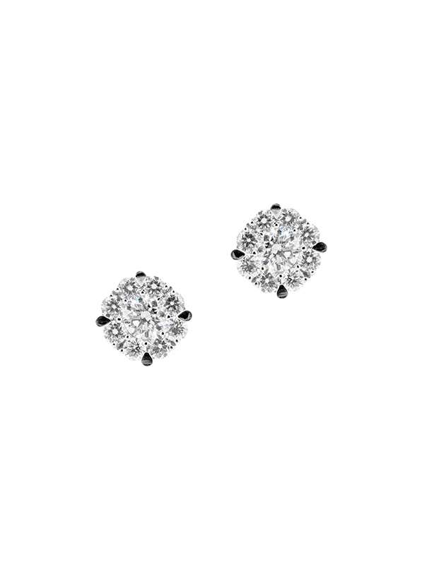 Gioiello firmato Crivelli. Orecchini lobo in oro bianco 18kt con diamante centrale contornato da piccoli diamanti taglio brillante.
