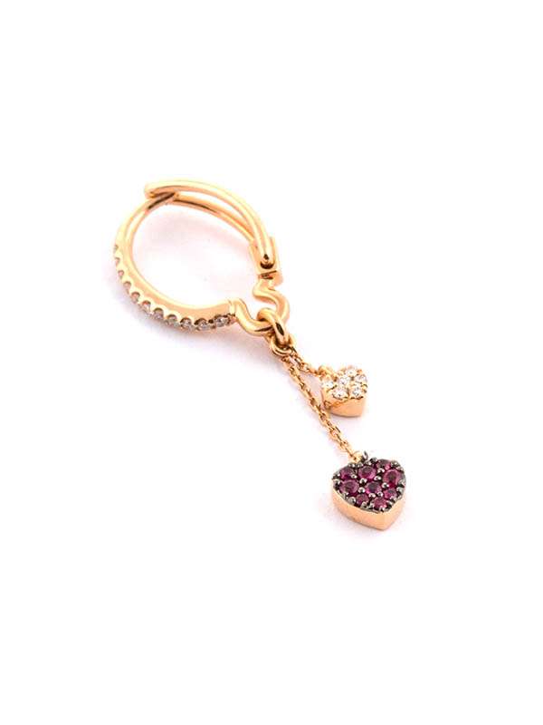 Orecchini a monachella cuore con rubini e diamanti sulla chiusura.