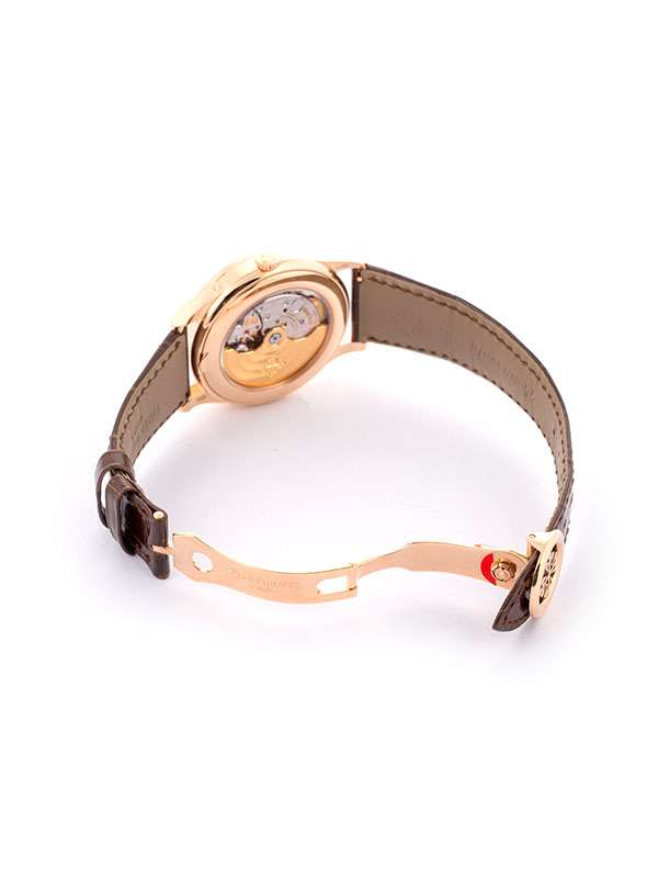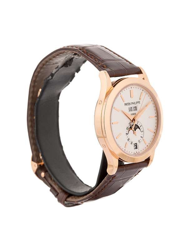 Modello con cassa in oro rosa 18kt. Cinturino in pelle di alligatore a squame quadrate, cucita a mano, color marrone cioccolato lucido. Fermaglio déployante in oro rosa 18kt. Quadrante opalino argentato. Indici delle ore sfaccettati in stile OBUS in opalino argentato e oro rosa. Lancette sfaccettate in stile dauphine in oro rosa. Fondello in vetro zaffiro. Movimento meccanico a carica automatica 26-330 S QA LU 24H. Calendario annuale. Giorno, data e mese a finestrella. Fasi lunari. Indicazione delle 24 ore. Secondi centrali. Riserva di carica 35-45 ore. Rotore centrale in oro 21 carati. Gyromax. Impermeabile fino a 30 metri. Un gioiello di eleganza e leggibilità, con la sua doppia finestrella giorno/mese a ore 12, la finestrella della data a ore 6 e il quadrante secondario 24 ore con fasi lunari, il Calendario Annuale automatico Referenza 5396 è diventato uno dei più grandi successi di Patek Philippe.