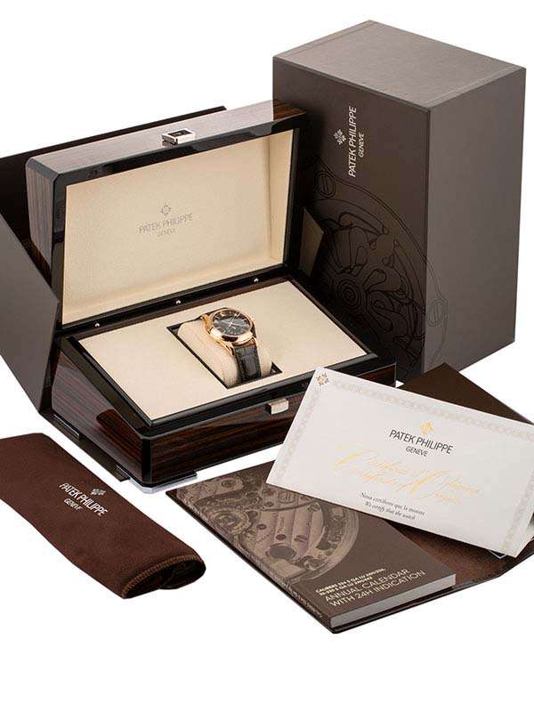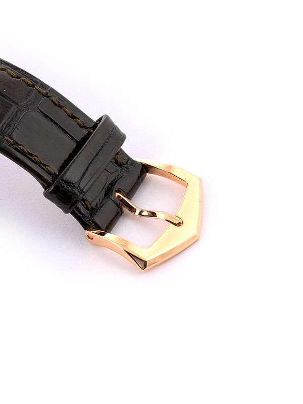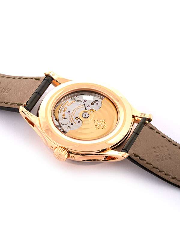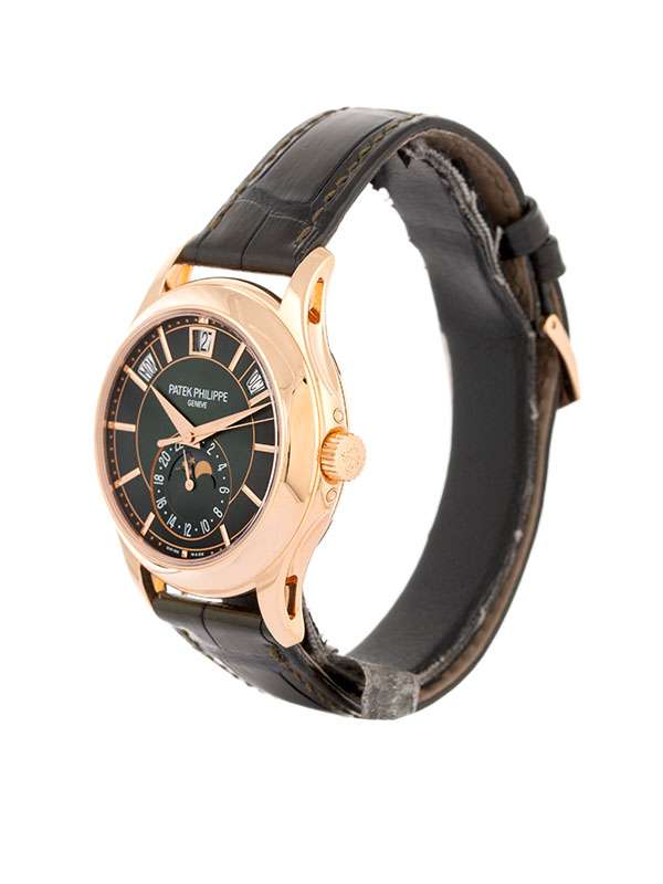Modello con cassa in oro rosa 18kt. Anse scheletrate. Cinturino in pelle di alligatore a squame quadrate, cucita a mano, patinata bicolore verde. Fibbia ad ardiglione in oro rosa 18kt. Quadrante verde oliva sunburst finitura soleil e bordo sfumato nero. Lancette dauphine sfaccettate in oro rosa e indici delle ore applicati. Cornice in oro rosa che sottolinea la finestrella della data. Vetro zaffiro. Fondello in vetro zaffiro. Calendario annuale. Giorno, data e mese a finestrella. Fasi lunari. Indicazione delle 24 ore. Secondi centrali. Movimento meccanico a carica automatica 26-330 S QA LU 24H. Riserva di carica 35 ore. Impermeabile fino a 30 metri. Questo segnatempo in oro rosa si distingue per il quadrante verde oliva, ravvivato da una lavorazione a raggiera e da un bordo sfumato nero, e per la cassa con fianchi smerlati e anse scheletrate. Il movimento automatico è dotato dell'ingegnoso meccanismo brevettato Patek Philippe Calendario Annuale, che richiede una sola correzione manuale all'anno, a fine febbraio.