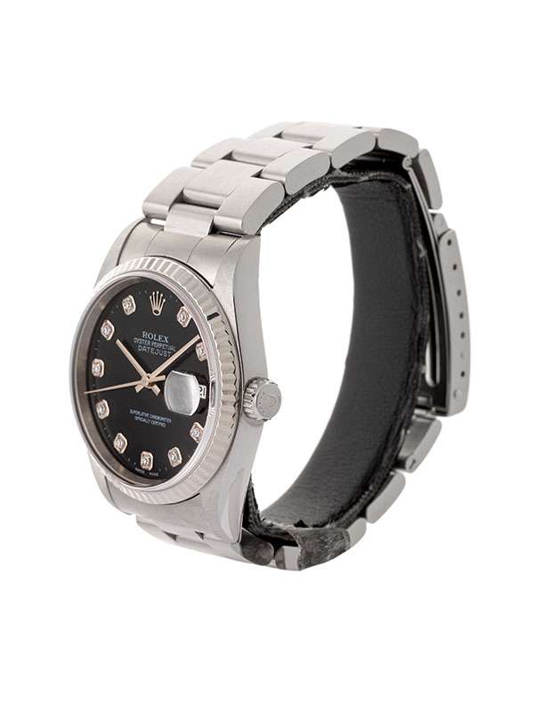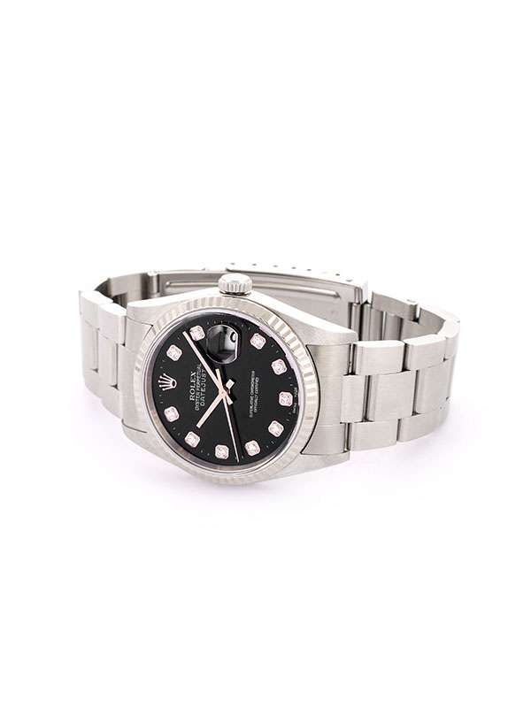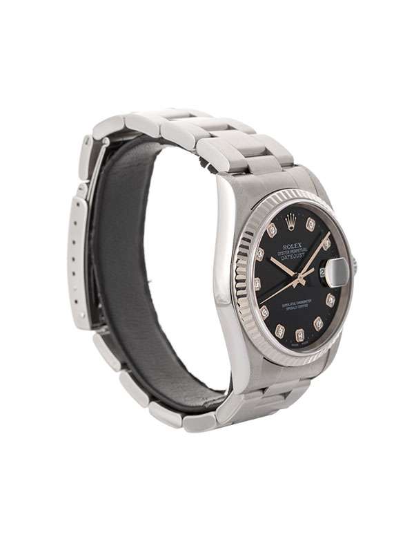 Modello con cassa in acciaio. Bracciale Jubilée in acciaio con chiusura déployante. Ghiera zigrinata in oro bianco 18kt. Quadrante nero con 10 diamanti. Lancette luminescenti. Datario a ore 3 e lente Cyclope. Vetro zaffiro. Movimento meccanico a carica automatica. Orologio anno 2004 corredato di Service Rolex datato 14 marzo 2023.