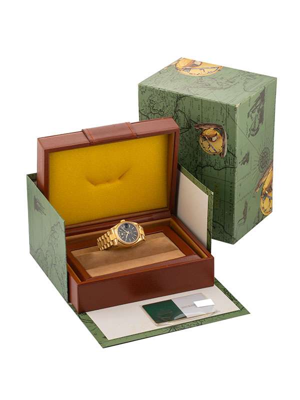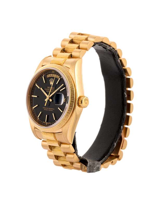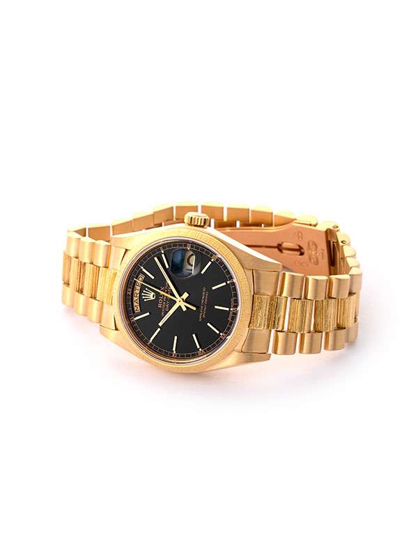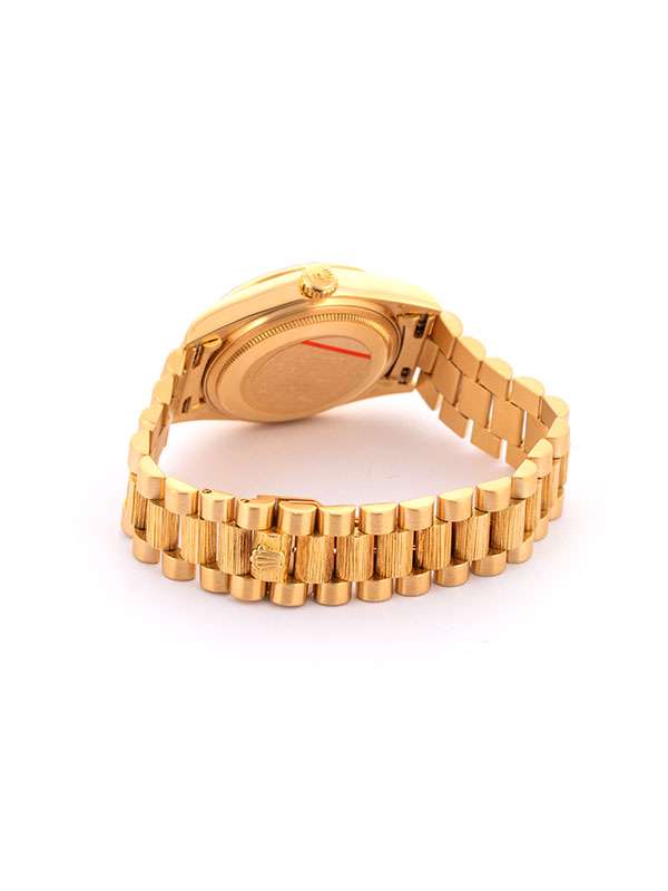 Modello con cassa in oro giallo 18kt Bracciale President finitura corteccia BARK FINISH. Lunetta in oro giallo finitura corteccia. Quadrante nero con indici. Datario a ore 3. Finestrella del giorno a ore 12. Lancette in oro giallo. Vetro zaffiro. Movimento meccanico a carica automatica. Orologio anno 1980 corredato di Service Rolex luglio 2025.