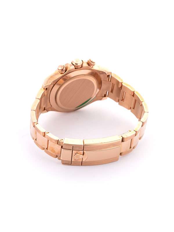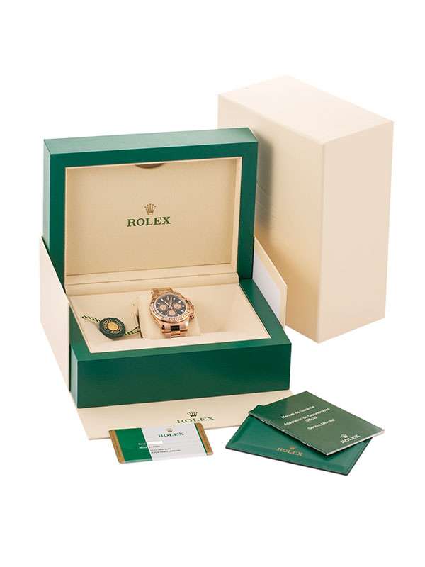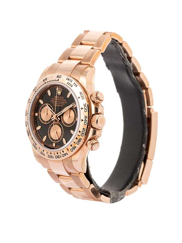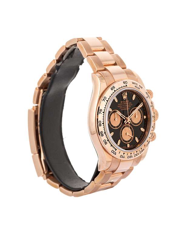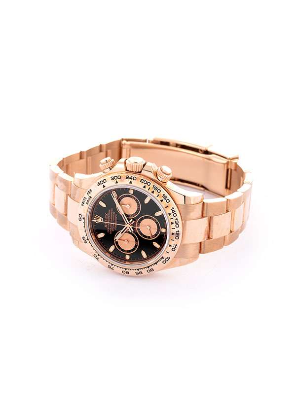 Modello con cassa in oro rosa 18kt Everose. Bracciale Oyster in oro rosa 18kt con fermaglio di sicurezza Oysterlock con chiusura pieghevole e maglia di prolunga rapida Easylink di 5 mm. Carrure monoblocco. Fondello e corona entrambi a vite. Corona di carica a vite con sistema di tripla impermeabilizzazione Triplock. Lunetta fissa con scala tachimetrica incisa in oro Everose 18Kt. Quadrante nero e rosa con contatori a cerchi concentrici. Funzioni ore e minuti al centro. Piccoli secondi a ore 6. Cronografo preciso a 1/8 di secondo mediante lancetta centrale. Contatore 30 minuti a ore 3. Contatore 12 ore a ore 9. Arresto dei secondi per una regolazione precisa dell’ora. Movimento meccanico a carica automatica. Vetro zaffiro antiscalfitture. Impermeabile. Orologio corredato di scatola e garanzia Rolex anno 2020.