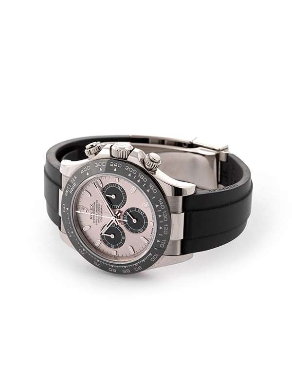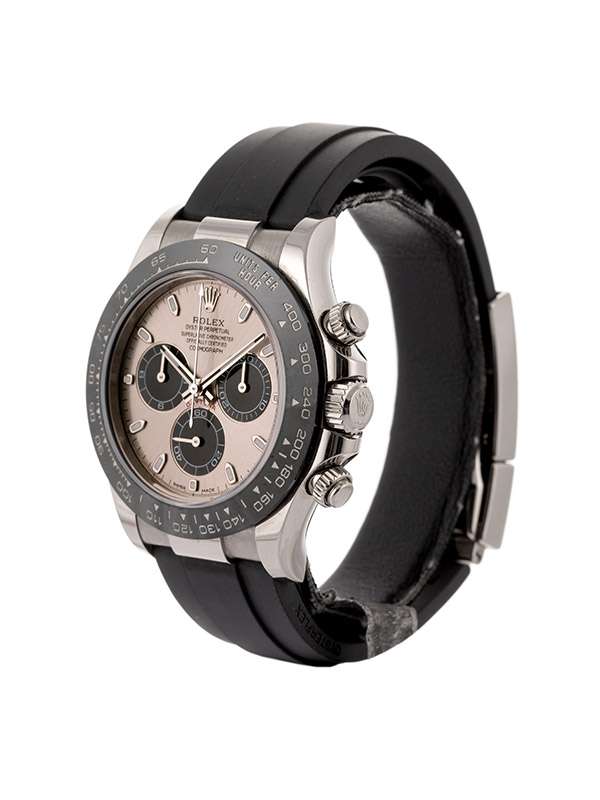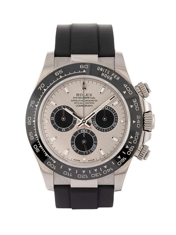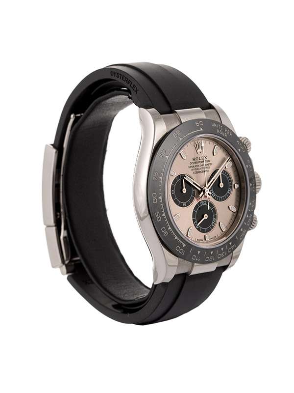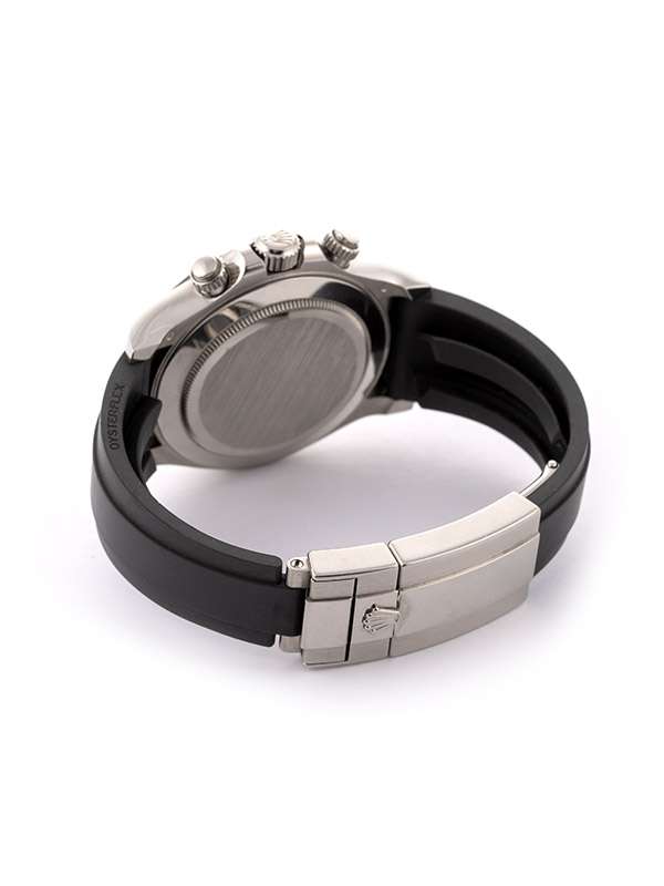 Modello con cassa in oro bianco 18kt. Bracciale Oysterflex con lama metallica flessibile rivestita di un elastomero ad alte prestazioni. Carrure monoblocco, fondello e corona entrambi a vite. Corona di carica a vite, con sistema di tripla impermeabilizzazione Triplock. Lunetta monoblocco Cerachrom in ceramica nera con scala tachimetrica incisaunetta in ceramica nera con scala tachimetrica incisa. Quadrante acciaio e nero. GHOST DIAL. Visualizzazione ad alta leggibilità Chromalight con materiale luminescente blu a lunga durata. Funzioni Ore e minuti al centro, piccoli secondi a ore 6. Cronografo preciso a 1/8 di secondo mediante lancetta centrale, contatore 30 minuti a ore 3, contatore 12 ore a ore 9. Arresto dei secondi per una regolazione precisa dell’ora. Autonomia di carica circa 72 ore. Vetro zaffiro antiscalfitture. Movimento meccanico a carica automatica. Impermeabile. Orologio corredato di scatola e garanzia datata luglio 2021.