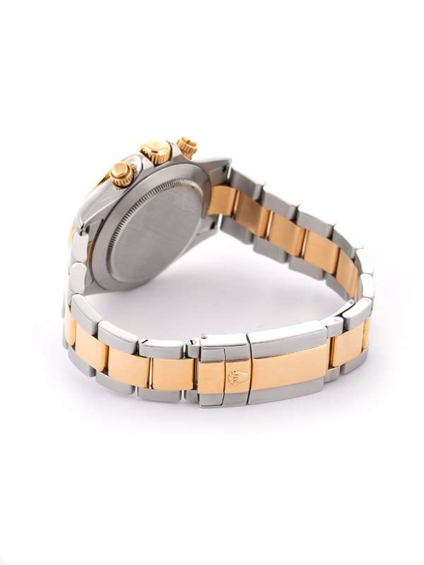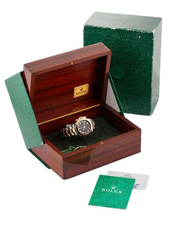 Modello con cassa in acciaio e oro giallo 18kt. Bracciale Oyster in acciaio e oro giallo 18kt con chiusura déployante e fermaglio Oysterclasp. Ghiera in oro giallo 18kt con scala tachimetrica incisa scala 400. Quadrante RACING DIAL blu con numeri arabi e lancette luminescenti. Tre contatori. Vetro zaffiro. Movimento meccanico a carica automatica con funzione cronografica. Orologio corredato di scatola in radica e Service Rolex datato aprile 2015.