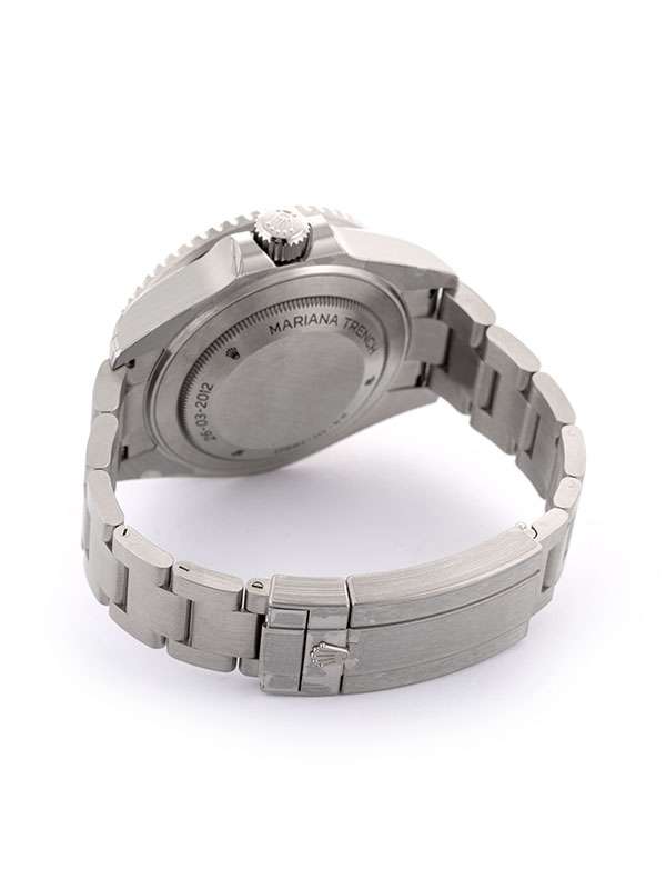 Modello con cassa in Titanio RLX. Bracciale Oyster in maglie massicce in Titanio RLX con fermaglio di sicurezza Oysterlock con chiusura pieghevole e sistema di allungamento Rolex Glidelock. Maglie di allungamento Fliplock. Grazie all’abbinamento di questi due accorgimenti, l’orologio può essere indossato sopra una muta da sub fino a 7 mm di spessore. Carrure monoblocco, fondello e corona entrambi a vite. Architettura della cassa con sistema Ringlock di Rolex, anello in acciaio arricchito con azoto e valvola per la fuoriuscita dell’elio. Lunetta girevole unidirezionale graduata 60 minuti, disco in ceramica Cerachrom antiscalfitture, numeri e graduazioni in platino. Corona di carica a vite con sistema di tripla impermeabilizzazione Triplock. Quadrante nero intenso. Visualizzazione ad alta leggibilità Chromalight con materiale luminescente blu a lunga durata. Funzioni ore, minuti e secondi al centro. Arresto dei secondi per una regolazione precisa dell’ora. Vetro zaffiro bombato di 9,5 mm antiscalfitture. Movimento meccanico a carica automatica. Calibro 3230. Riserva di carica circa 70 ore. Impermeabile fino a 11.000 metri, valvola per la fuoriuscita dell’elio. Il titanio RLX, una lega di titanio grado 5 selezionata da Rolex, si distingue per la sua leggerezza e la sua resistenza alle deformazioni e alla corrosione. L’orologio sperimentale sceso con James Cameron nella fossa delle Marianne, insensibile alla pressione presente negli abissi marini, era realizzato in acciaio 904L e, per via del suo peso, non poteva essere indossato al polso. Il ricorso al titanio RLX per la fabbricazione della cassa e del bracciale del Deepsea Challenge ha consentito di alleggerirlo e di ridurne il peso del 30% rispetto all’esemplare sperimentale di James Cameron. L’orologio presenta una satinatura particolarmente marcata sul bracciale e sull’insieme della cassa, fatta eccezione per le spallette di protezione della corona. Per sottolineare la sagoma delle anse, gli spigoli superiori sono stati smussati, poi lucidati.
