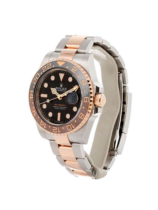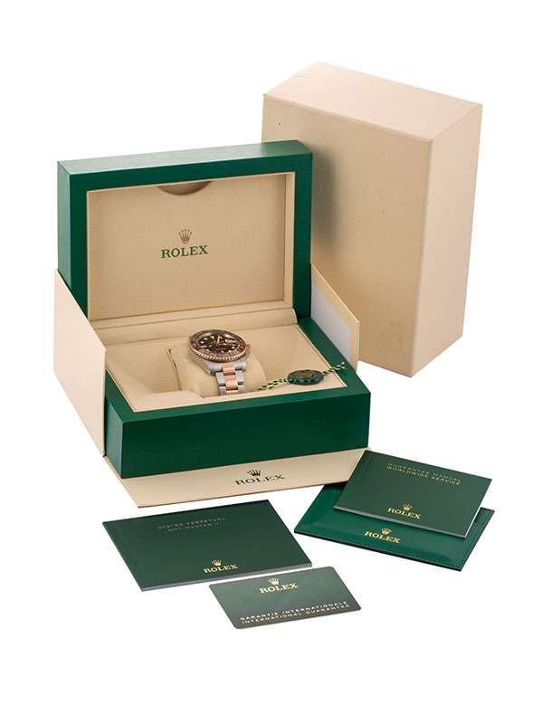 Modello con cassa in acciaio e oro rosa 18kt Oystersteel e oro Everose. Bracciale Oyster a maglie piatte in acciaio e oro rosa 18kt. Carrure monoblocco, fondello e corona entrambi a vite. Corona di carica a vite, con sistema di tripla impermeabilizzazione Triplock. Lunetta girevole bidirezionale graduata 24 ore. Disco Cerachrom bicolore marrone e nero in ceramica, numeri e graduazioni incisi. Quadrante nero. Funzioni ore, minuti e secondi al centro. Visualizzazione 24 ore. Secondo fuso orario mediante regolazione rapida e indipendente dalla lancetta delle ore. Data istantanea. Arresto dei secondi per una regolazione precisa dell’ora. Datariio a ore 3 e lente Cyclope. Visualizzazione ad alta leggibilità Chromalight con materiale luminescente blu a lunga durata. Vetro zaffiro antiscalfitture. Movimento meccanico a carica automatica. Impermeabile. Orologio corredato di scatola e garanzia Rolex datata dicembre 2023.