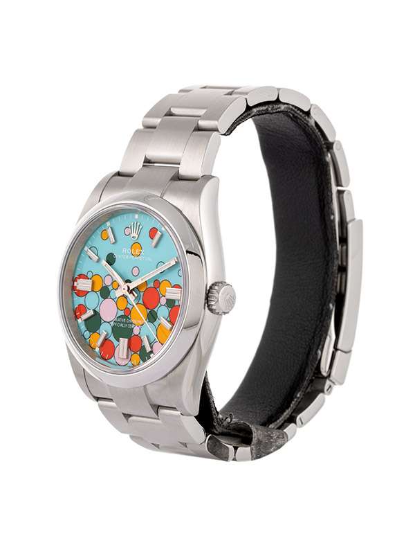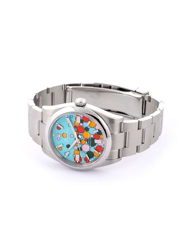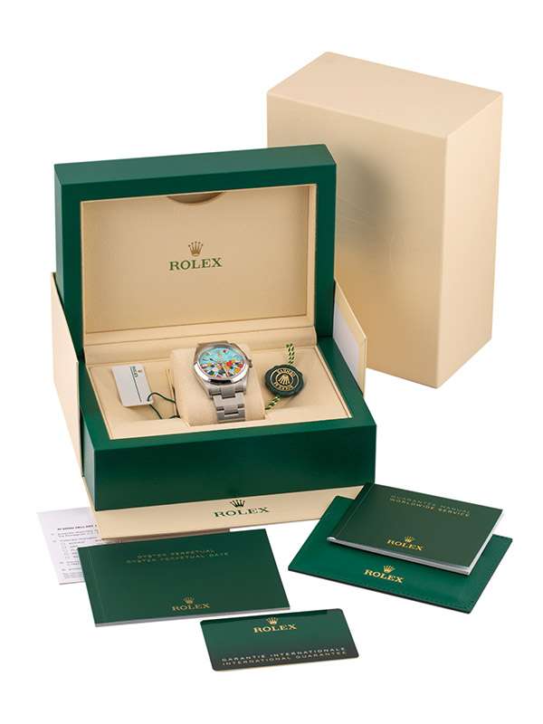 Modello con cassa in acciaio Oystersteel. Bracciale Oyster in acciaio Oystersteel. Fermaglio Oysterclasp con chiusura pieghevole e maglia di prolunga rapida Easylink di 5 mm. Carrure monoblocco, fondello e corona entrambi a vite. Lunetta bombata in acciaio. Corona di carica a vite con sistema di doppia impermeabilizzazione Twinlock. Quadrante turchese chiaro con motivo Celebration. Funzioni ore, minuti e secondi al centro. Arresto dei secondi per una regolazione precisa dell’ora. Visualizzazione ad alta leggibilità Chromalight con materiale luminescente blu a lunga durata. Vetro zaffiro antiscalfitture. Movimento meccanico a carica automatica. Calibro 3230. Riserva di carica circa 70 ore. Impermeabile. Orologio corredato di scatola e garanzia datata febbraio 2024.