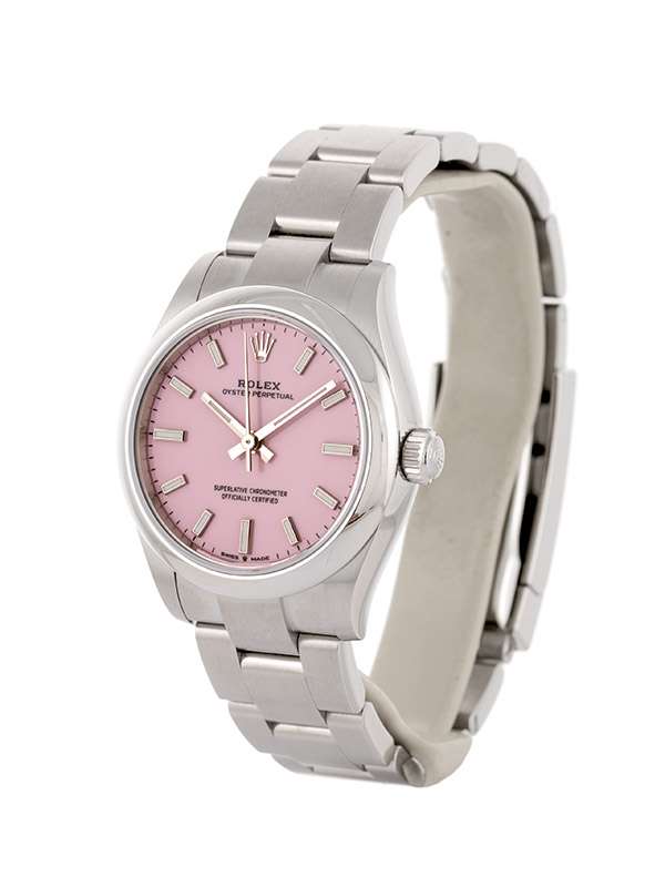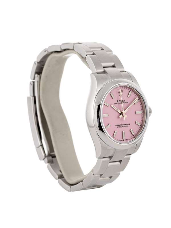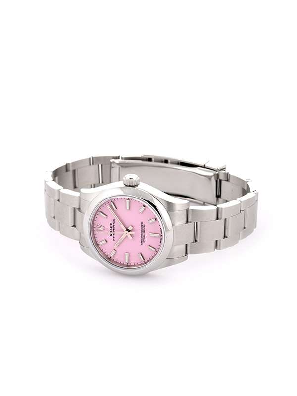 Modello con cassa in acciaio Oystersteel. Bracciale Oyster in acciaio con fermaglio Oysterclasp con chiusura pieghevole e maglia di prolunga rapida Easylink di 5 mm. Carrure monoblocco, fondello e corona entrambi a vite. Corona di carica a vite, con sistema di doppia impermeabilizzazione Twinlock. Lunetta bombata in acciaio. Quadrante rosa candy. Visualizzazione ad alta leggibilità Chromalight con materiale luminescente blu a lunga durata. Funzioni ore, minuti e secondi al centro. Data istantanea con correzione rapida. Arresto dei secondi per una regolazione precisa dell’ora. Vetro zaffiro antiscalfitture. Movimento meccanico a carica automatica. Riserva di carica circa 55 ore Impermeabile fino a 100 metri.